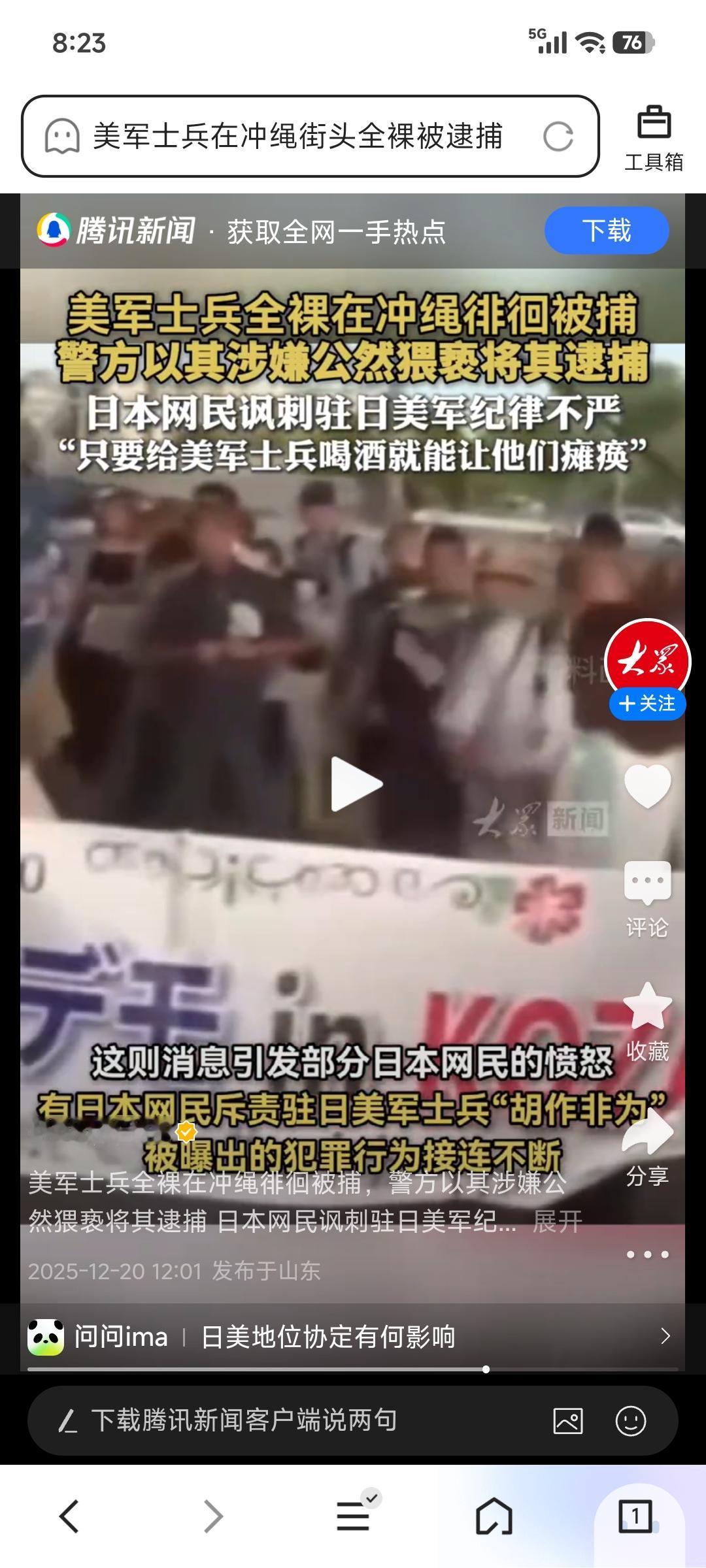 驻日美军又整幺蛾子了!12月19日凌晨,冲绳县北谷町一名22岁美国海军“的黎波里”号两栖攻击舰海兵,全裸在街上晃悠,浑身酒气,被警方以公然猥亵罪逮捕。消息一出,日本网民愤怒不已,斥责他们胡作非为。 这些年驻日美军劣迹可不少。1995年三名美军施暴12岁少女,2024年冲绳有4起美军性暴力事件,2025年6月又出现美军强制猥亵未成年少女的事,酒驾、非法闯入等乱象也不断。驻日美军如此肆无忌惮,就是因为治外法权和日本政府的纵容,可怜冲绳民众一直深受其害。