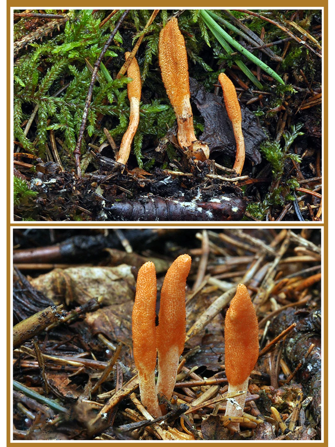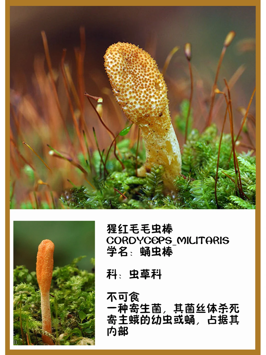 猩红毛毛虫棒 cordyceps_militaris 学名:蛹虫棒 科:虫草科 图片 ©josef hlasek 不可食 一种寄生菌,其菌丝体杀死寄主蛾的幼虫或蛹,占据其内部