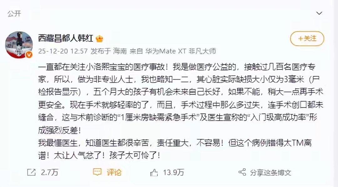 医院回应小洛熙尸检报告,发布情况说明后又删了,越删则越让人起疑!家属晒的尸检报告明明白白写着没查到当初说的那种缺损,6.5厘米手术创口没缝合,补片还没固定好,结果医院发个回应说1cm缺损影响发育,转头就偷偷删掉,这操作太反常了。五个月大的宝宝,本来3mm缺损可能自愈,被说不手术会脑瘫才上了手术台,七个多小时手术完没几天就没了,卫健委都认定医院有操作过失、风险评估不足,相关人都被处分了。现在尸检结果和术前诊断对不上,医院不想着好好解释,反而删回应躲躲闪闪,这是哪门子解决问题的态度?家属就想要个真相,韩红也一直在关心小洛熙宝宝,这事儿光处分人不够,得把手术指征、操作失误的细节说清楚,别让小洛熙白来人间一趟。
