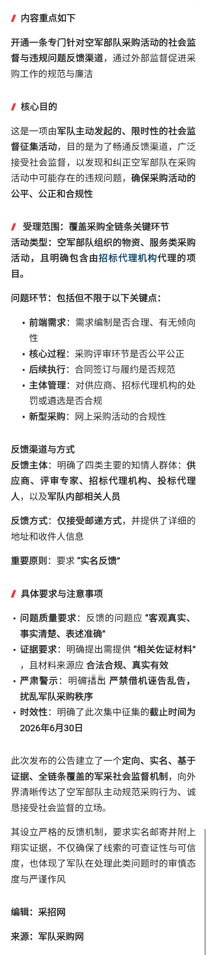 空军带了头:我们地方政府和央企跟不跟?12月15日,军队采购网发布《关于征集空军部队违规采购问题的公告》,宣布为进一步畅通违规采购问题反馈渠道,广泛接受社会监督,现面向社会公开征集违规采购相关信息。公告明确,主要受理范围涵盖空军部队组织开展的物资、服务类采购活动中存在的违规问题(包括招标代理机构组织项目),涉及需求编制、采购评审、合同履约、供应商处罚、招标代理机构遴选、网上采购等多个环节。在反腐败工作中,空军此次主动向社会公开征集问题线索,体现了对公众监督的信任与依靠。尽管直接举报可能面临种种不便,但通过网络渠道,只要掌握相关线索,出于对军队纯洁性的维护,相信广大群众会积极参与举报。这种公开接受监督的方式,实际上比单纯依靠制度约束更具震慑力,也更能形成持续有效的监督氛围。空军已做出表率,各级地方政府以及央企、国企——例如中国航天、中国航空、中国兵器、中国船舶等——也应当积极跟进,建立类似的公开监督机制。否则,采购领域的腐败问题难以从根本上得到遏制