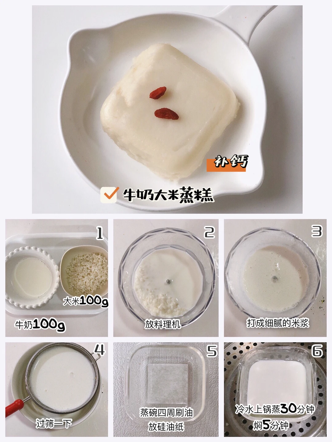 制作方法:大米提前一晚浸泡,控干水和牛奶一起放料理机打成细腻的米浆,滤网过筛一下,口感更细腻。蒸碗四周刷油垫油纸,倒入米浆,冷水上锅蒸30分钟关火焖5分钟即可。