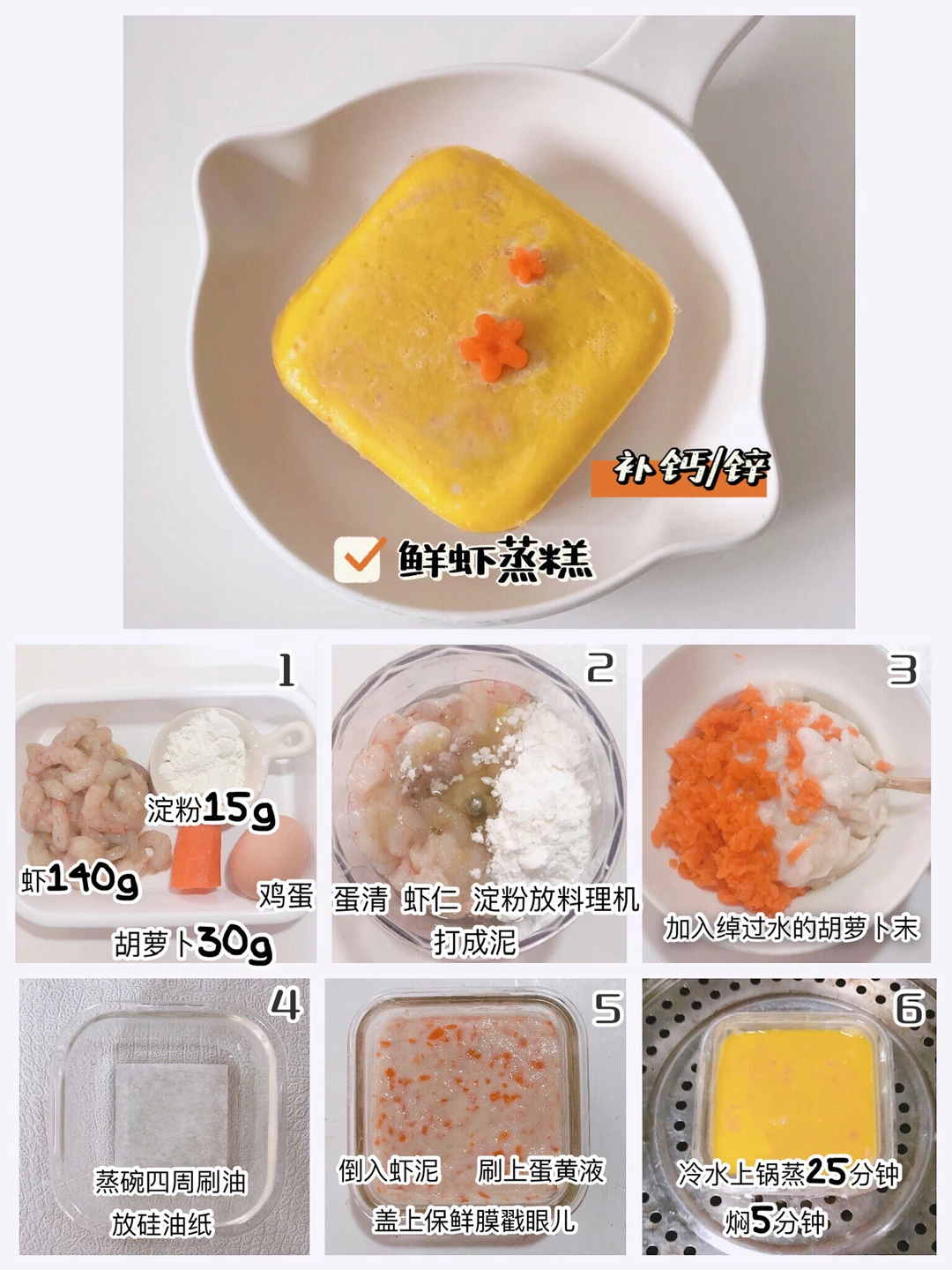制作方法:虾仁洗净去腥,胡萝卜去皮焯水切碎末,虾仁、蛋清、淀粉放料理机打成泥,再放入胡萝卜碎拌匀,蒸碗刷油垫油纸,倒入虾泥,冷水上锅蒸25分钟关火焖5分钟即可