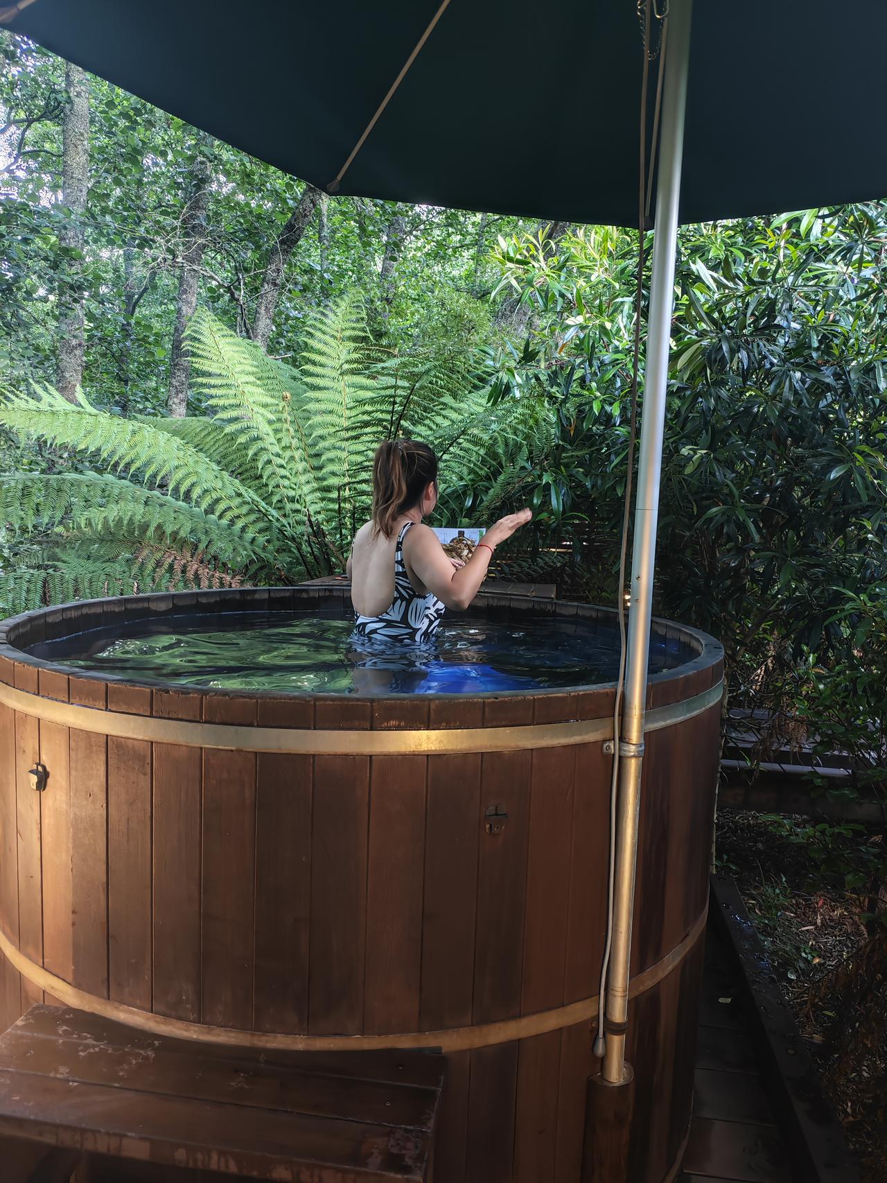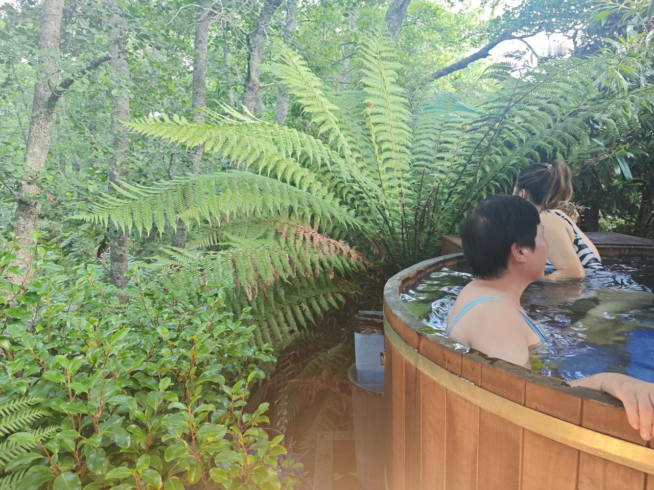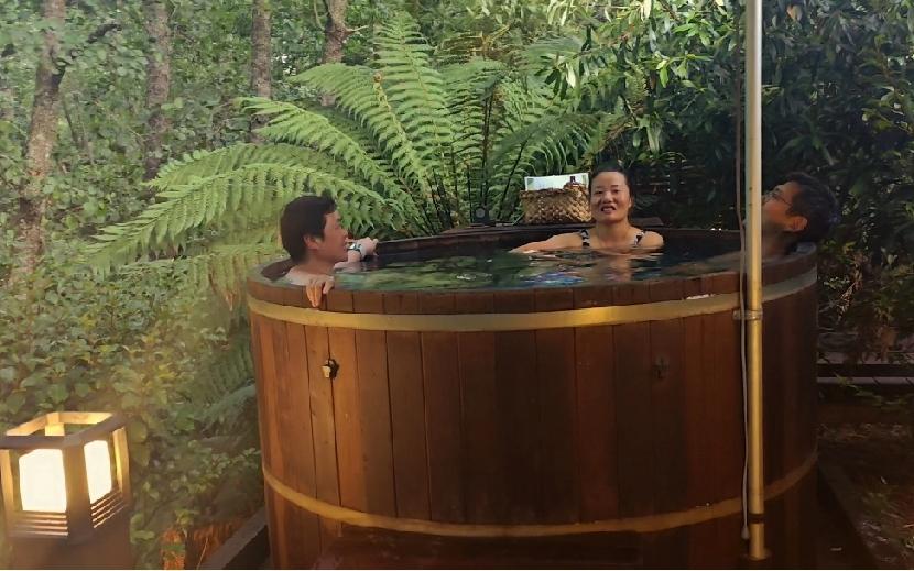 泡泡森林温泉 离开罗托鲁瓦大排档,来到了预定的这家森林温泉酒店。这里是地热城,开办的各种温泉店比较多,女儿选了这家,说是网上评价比较好,让我们也体验一把…… 这里好像是个房车露营地,周围停了不少的房车,想着应该和这家森林温泉酒店有关吧…… 森林温泉,就是把泡温泉的大木桶放在森林里的绿树丛中,通上地热水,让人们泡温泉的同时,既能感受到大自然森林里的气息,也能享受到山林间的鸟鸣,加上一些灯光效果,感觉非常舒适惬意…… 起初还担心天气热,没有泡温泉的感觉,没有想到下午降温了,还飘了几滴雨,凉飕飕的,这样的天气泡温泉真是再理想不过的了…… 森林温泉最大的好处是身处温泉里,心在森林间,空气清新润,享受在……