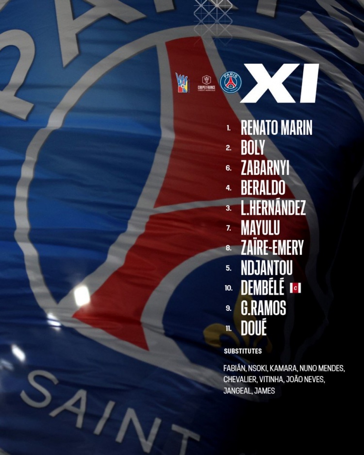 巴黎首发:1-雷纳托·马林、2-大卫·博利、6-扎巴尔尼、4-贝拉尔多、3-卢卡斯·埃尔南德斯、7-马尤卢、8-扎伊尔·埃梅里、5-恩贾恩图、10-登贝莱、9-贡萨洛·拉莫斯、11-杜埃