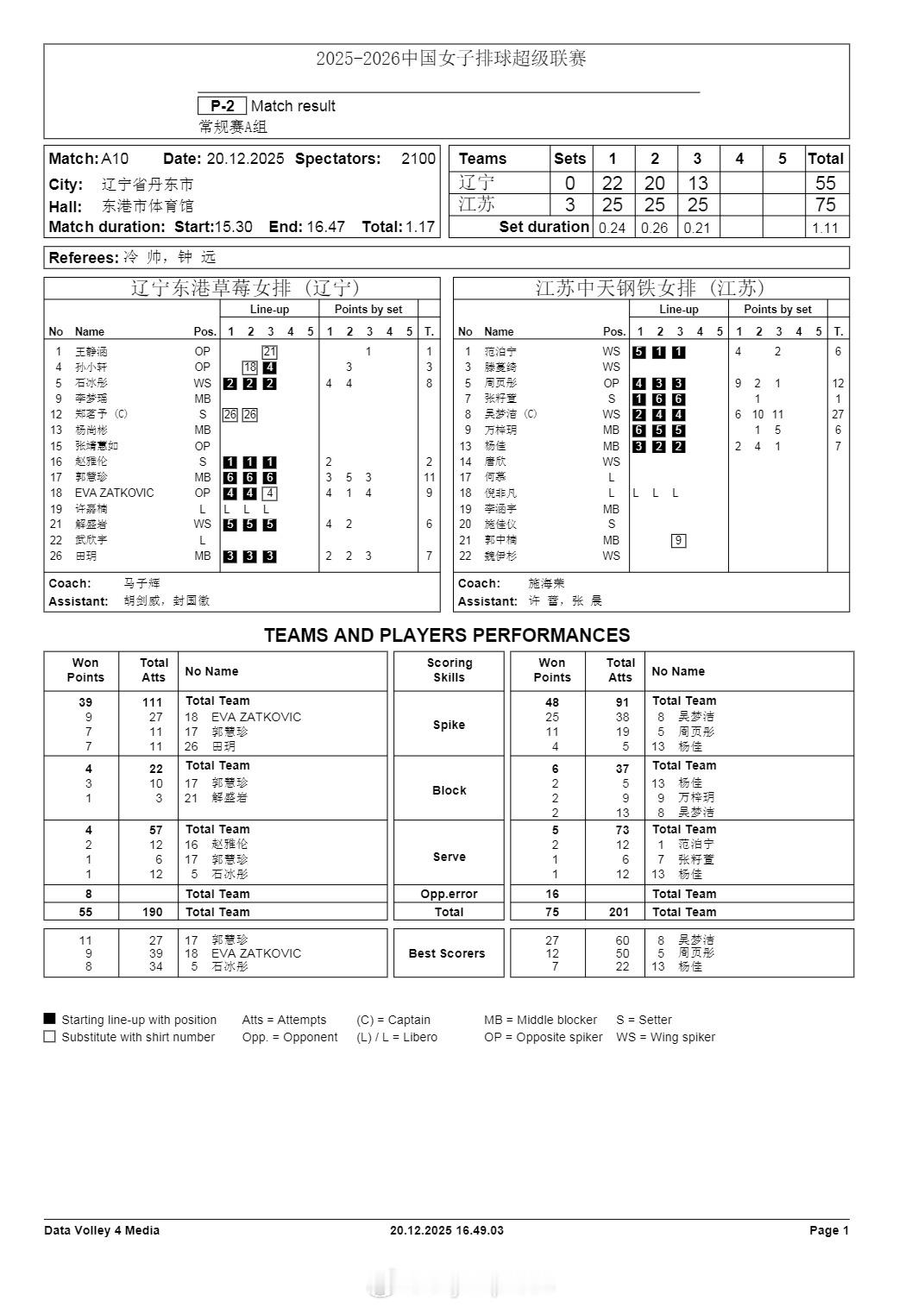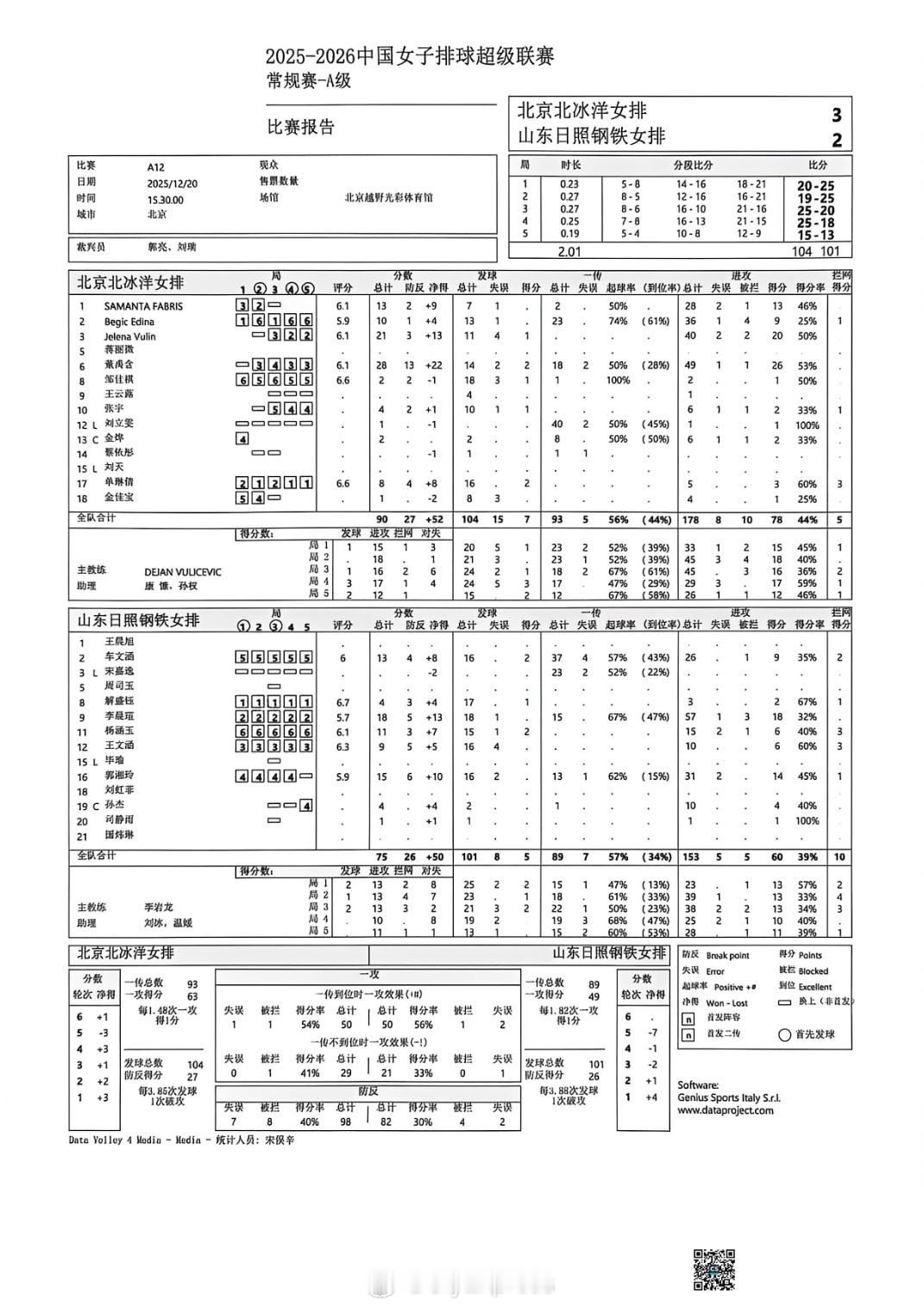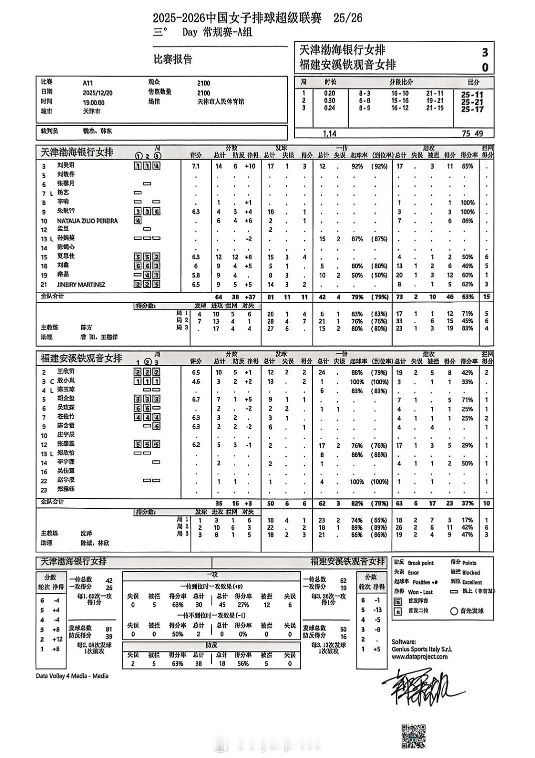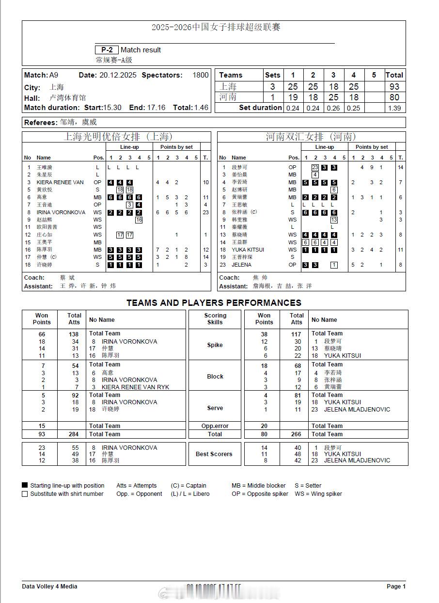 【排超女排联赛本轮A级比赛赛果和技术统计】排超联赛 12月20日,女排联赛4场A级赛赛果如下(主队在前),技术统计见图:上海3-1(25-19/25-18/18-25/25-18)河南辽宁0-3(22-25/20-25/13-25)江苏北京3-2(20-25/19-25/25-20/25-18/15-13)山东天津3-0(25-11/25-21/25-17)福建