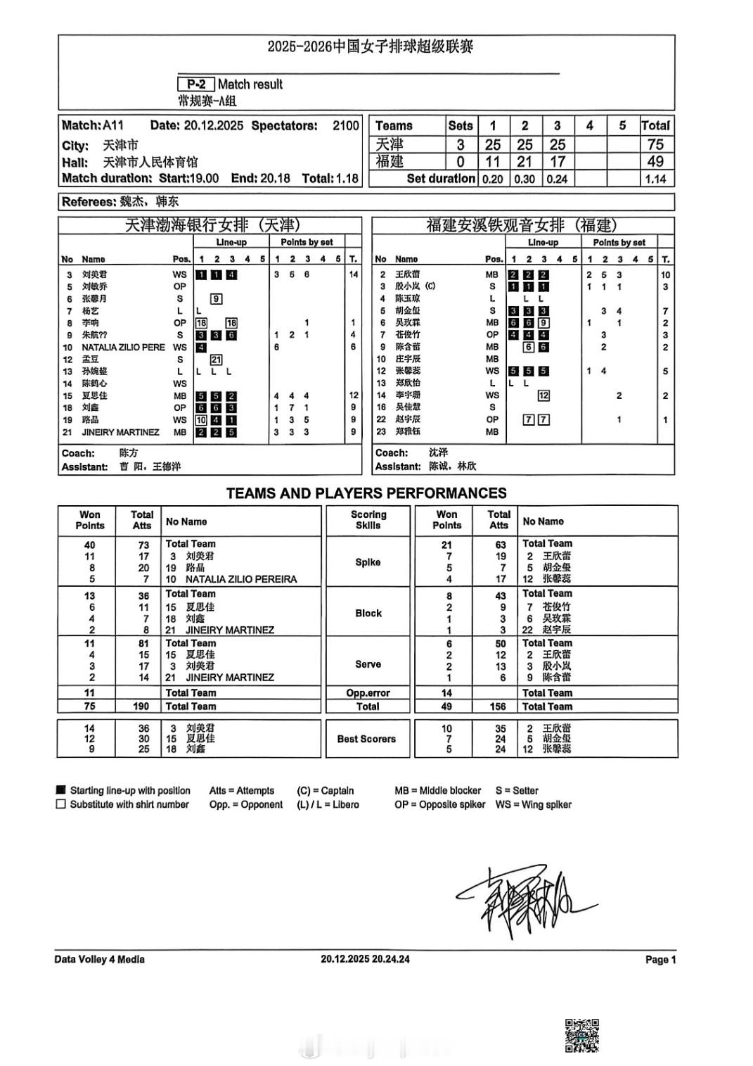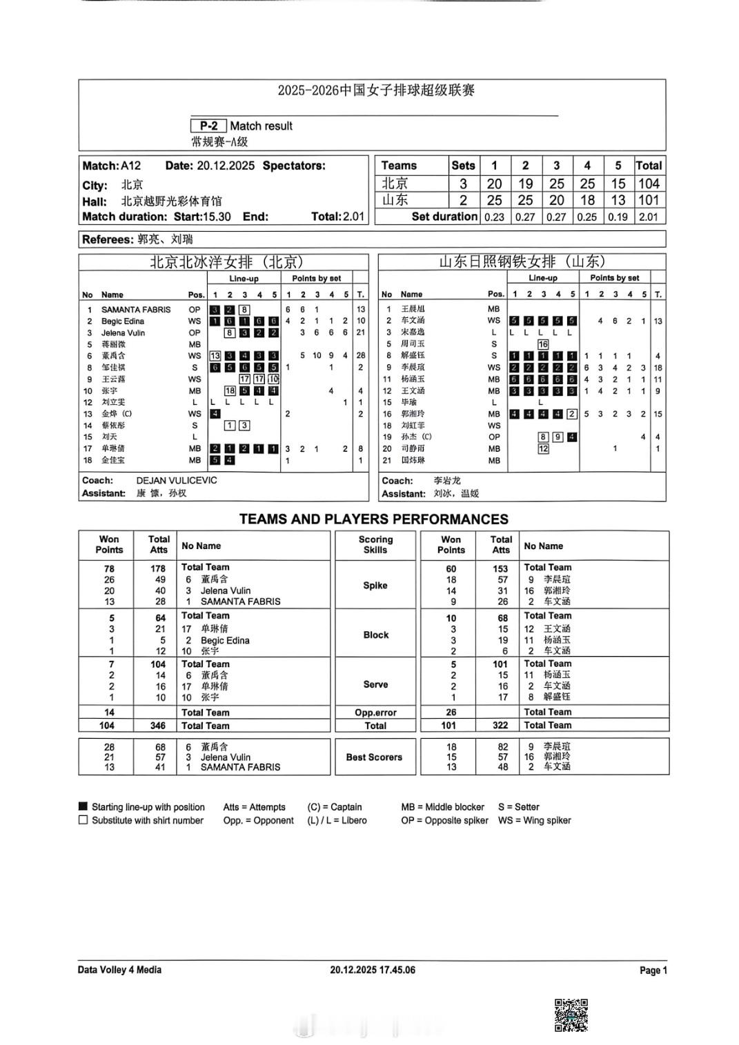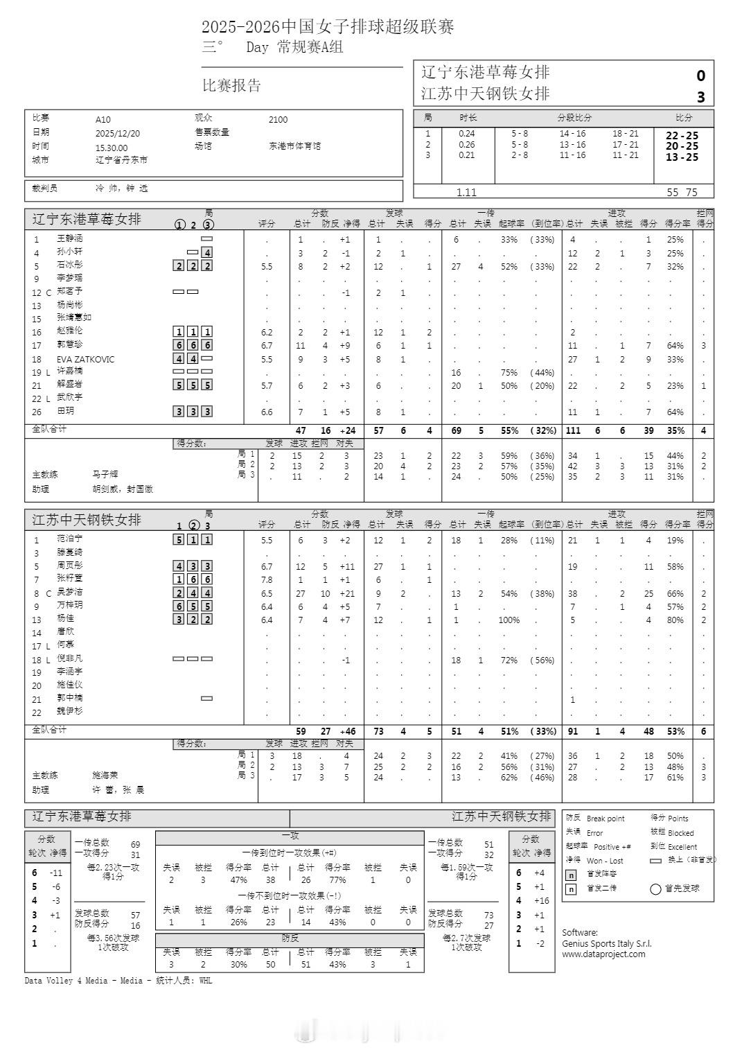 【排超女排联赛本轮A级比赛赛果和技术统计】排超联赛 12月20日,女排联赛4场A级赛赛果如下(主队在前),技术统计见图:上海3-1(25-19/25-18/18-25/25-18)河南辽宁0-3(22-25/20-25/13-25)江苏北京3-2(20-25/19-25/25-20/25-18/15-13)山东天津3-0(25-11/25-21/25-17)福建