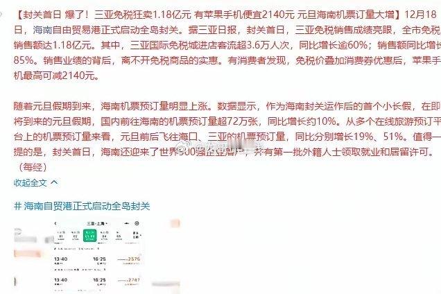 周末消息面,海南封关免税消息刷屏,周五海南板块大涨5.19%,全A地区行业板块第一,12月18日正式封关大跌,明显的弱转强。海南周五更多的是消费逻辑,免税逻辑,周末很明显,消费逻辑加强,下周市场延续预期,叠加元旦假期,旅游,消费,观察从福建板块出来的资金能否进入海南。周五尾盘,福建龙头集体直线跳水大跌,平潭发展,合富中国,东百集团,海峡创新等,炒地图的都是一类资金,之前福建,海南一直联动。下周重点观察,海南自贸板块。1.封关首日 爆了!三亚免税狂卖1.18亿元 有苹果手机便宜2140元 元旦海南机票订量大增2.海南封关120多万卡宴只卖60万 40克金饰能省1万多元!网友:已经在看机票了