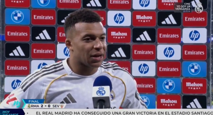 在追平C罗纪录后,姆巴佩做出了C罗标志性的“SIU”庆祝动作。姆巴佩赛后接受了皇马TV的采访。