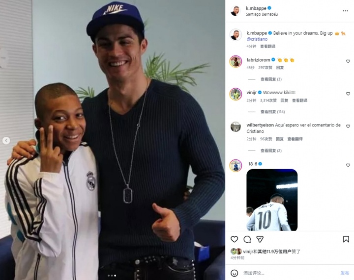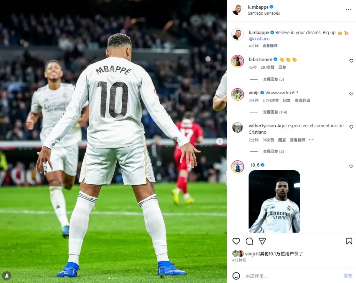 值得一提的是,刚刚在社媒换掉自己手举皇马球衣头像,换成身穿巴西队球衣头像的维尼修斯也在这条动态下进行了评论:“WowwwwKiki(姆巴佩名为Kylian)!!!!”