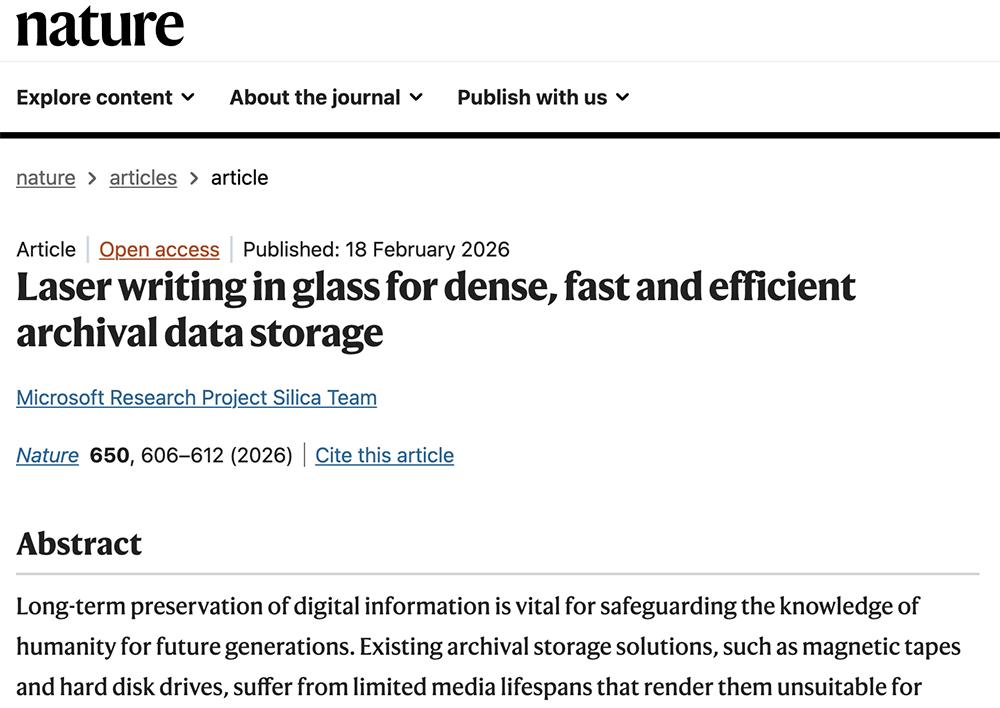 智东西2月19日报道,微软研究院今日在国际顶级学术期刊Nature上发表了一项关于新型玻璃存储数据方法的突破性成果,能将信息保存至少10000年。