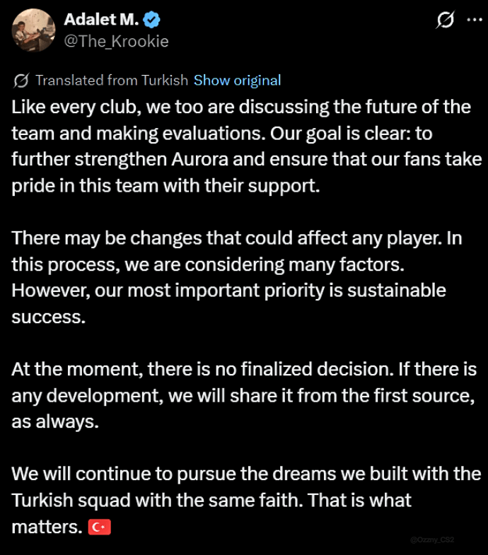 虎扑12月21日讯CS2外媒JUSTIN报道。Aurora战队CEO在关于下赛季阵容变动的传闻后发表声明称:“可能会有影响任何选手的变动”
