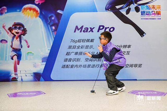 赛场之外,乌镇世界互联网科技馆也全面焕新,通过三层空间融合AI互动、VR探险、机器人竞技等项目,增设AR眼镜体验、AIGC工坊、机器人互动等二十余项趣味体验,打造沉浸式科技探索场景,变身集科技展示、互动体验、教育科普于一体的奇幻课堂,为全球青少年打造一个可感、可触、可玩的“科技试验场”。记者在科技馆二楼看到,许多学生戴着VR眼镜,不时发出惊叹声,“戴上眼镜,我不仅能触摸温顺的虚骨龙,转而还可以遨游太空,简直太魔幻了!”