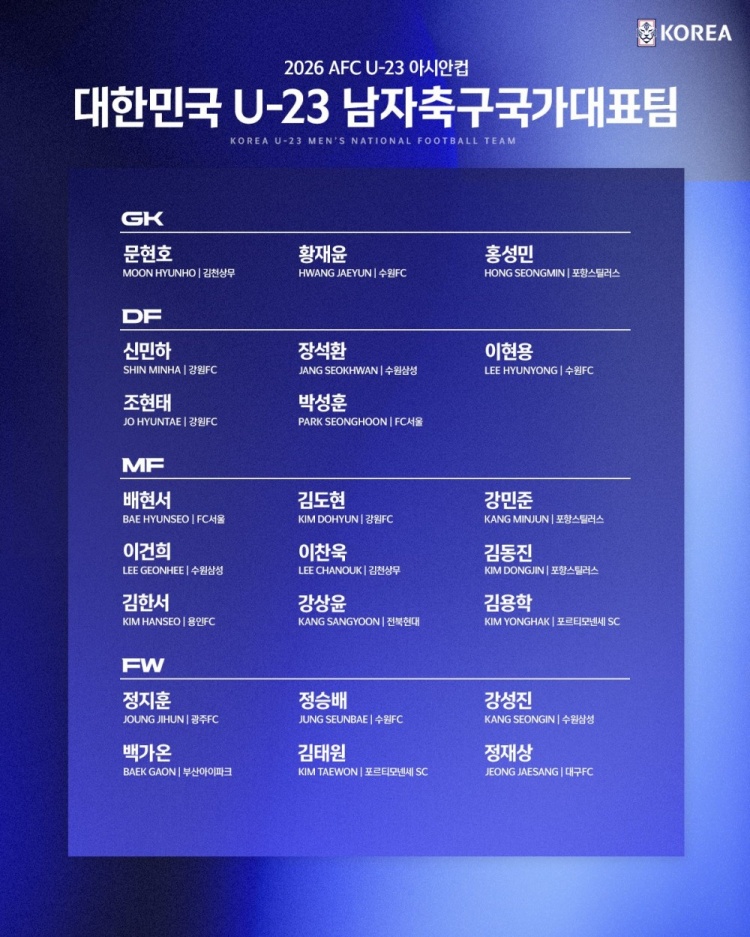 直播吧12月21日讯今日,韩国U23国家队公布了球队参加U23亚洲杯的名单,球员基本都来自国内联赛,2名留洋葡甲波尔蒂芒人的球员入选。具体如下: