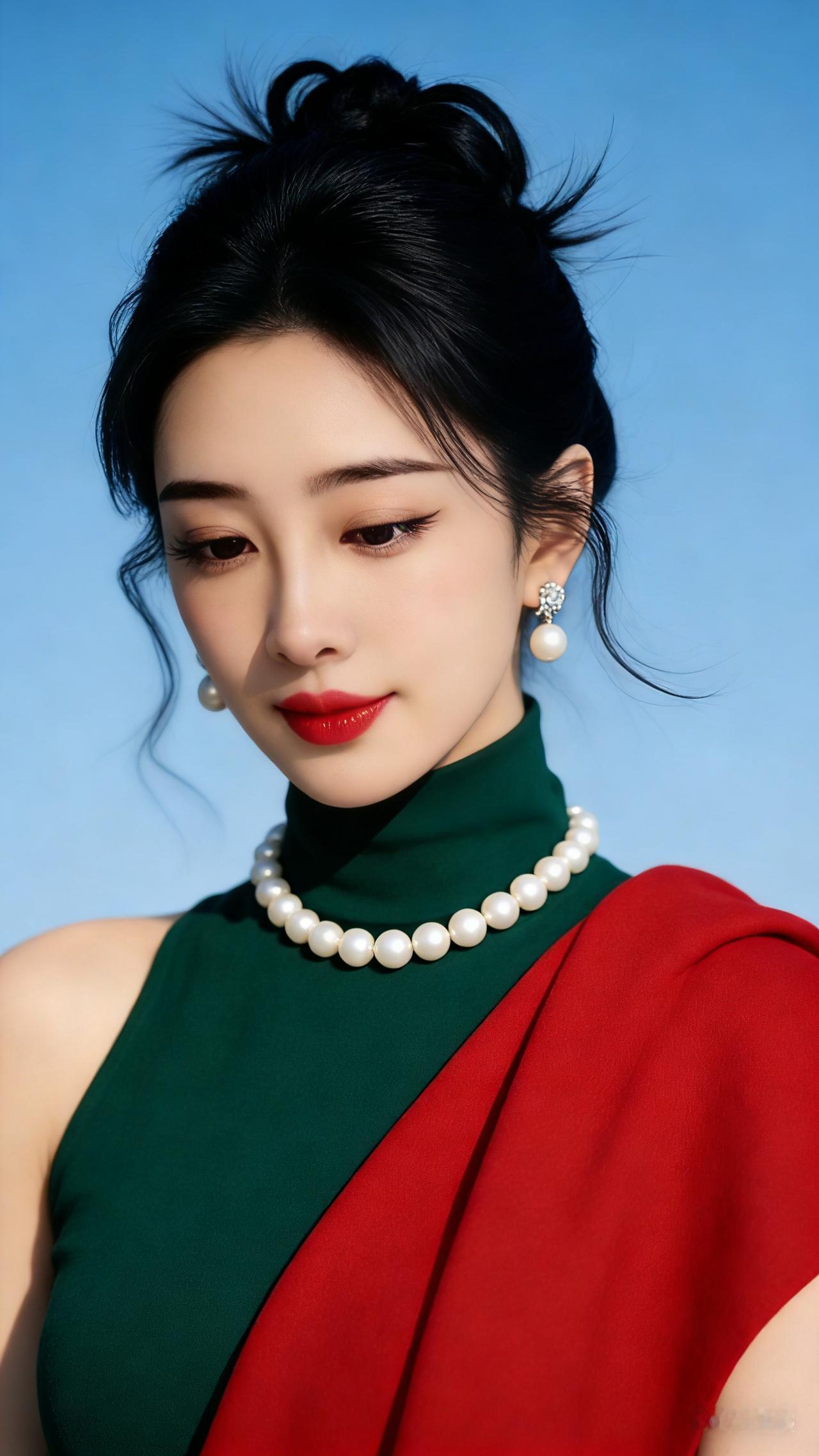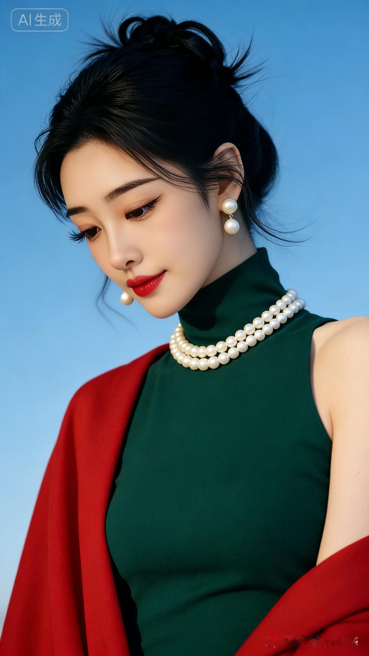 气质女孩精致妆容搭配珍珠项链,红绿撞色更显时尚魅力。
