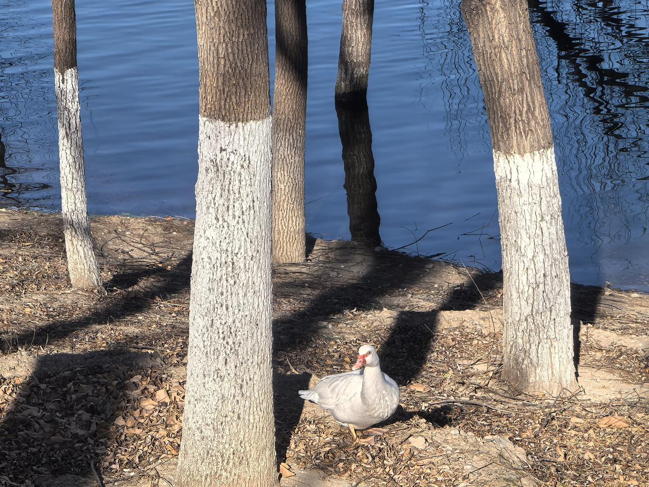 北京西郊雨水池公园,有很大的湖面,发现一只混进大雁队里的鸭子,伙伴们都飞走了,只有他在水边的树林中等待他们春天归来。