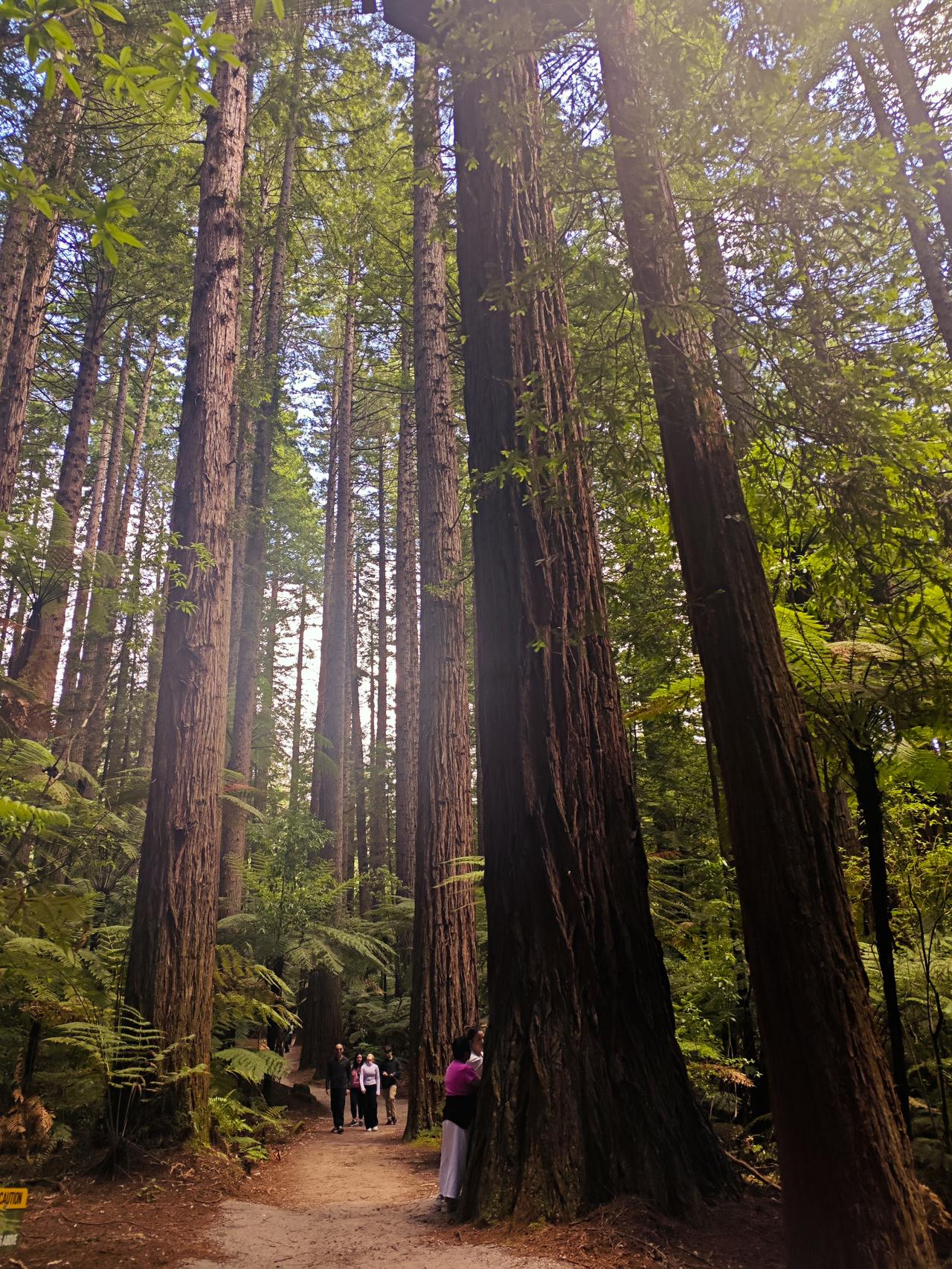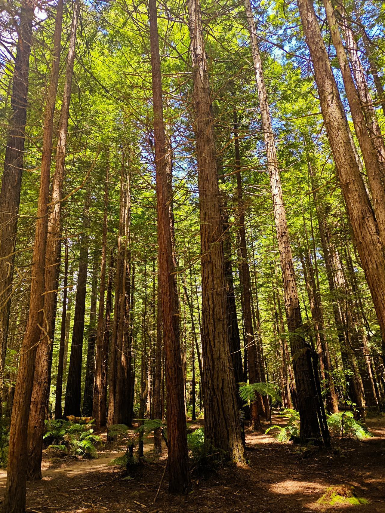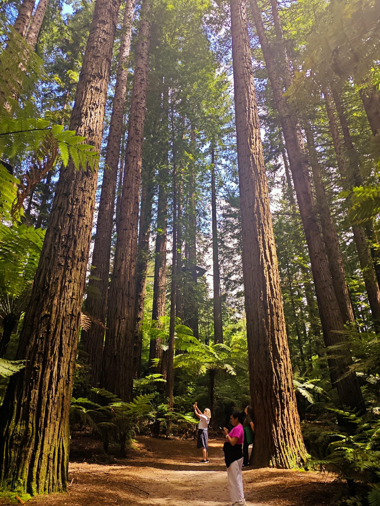 红杉林之美 罗托鲁瓦的红树林很有名,女儿说带我们进去徒步…… 来到此处,让我惊艳至极啊!这是一片很大的红杉树林,挺拔矗立,个别底部粗达三抱,大部分在两抱左右…… 再说说它的高度,基本都在50米左右,这么高、这么粗、这么大的红杉树林确实还是第一次看到…… 红杉林里还有空中徒步项目,就是在十多米高的空中搭个通道,有的是网道连接,有的是钢丝滑道,我们在底下看还是非常刺激的哈…… 咱们对红杉树木不了解,不知道红杉树长这么高需要多长时间。当我走近一棵较高的红杉树下时,看见树皮的皱裂处,用我的手掌实测了一下,这个树皮的深度足有20多厘米…… 红杉树,在我们老家的公路边也有零星种植,只感觉它长得直,就像路旁一排高高的士兵,三四十年过去了,它的直径好像只有三四十厘米长…… 离开红杉林时有些不舍,回头再看一眼,让红杉林之美记忆永存……