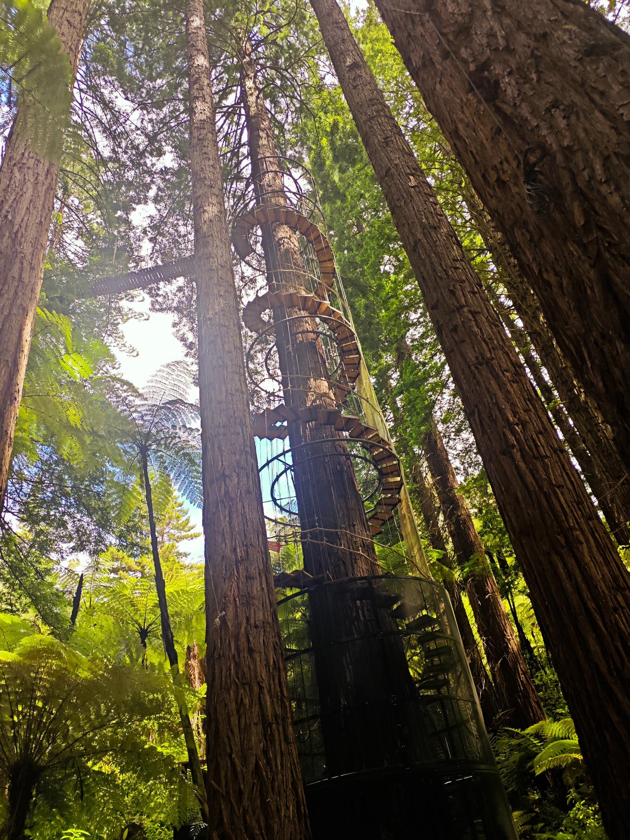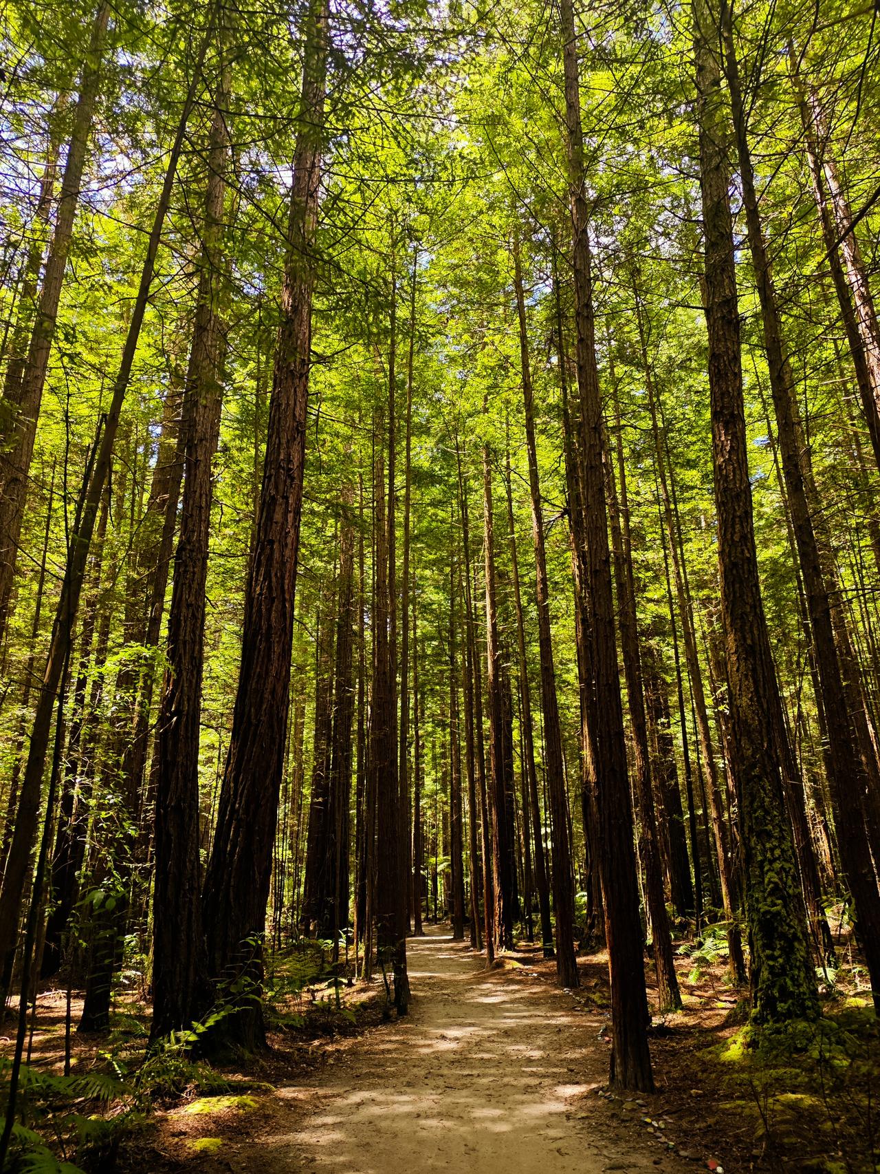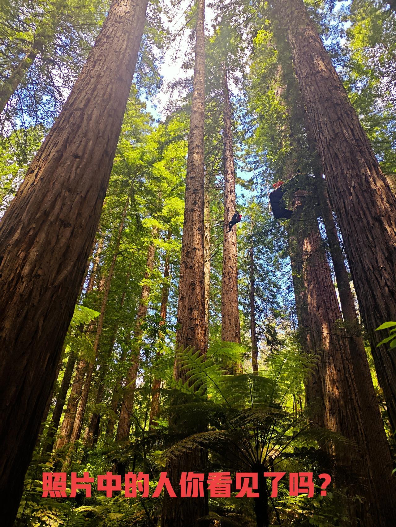 红杉林之美 罗托鲁瓦的红树林很有名,女儿说带我们进去徒步…… 来到此处,让我惊艳至极啊!这是一片很大的红杉树林,挺拔矗立,个别底部粗达三抱,大部分在两抱左右…… 再说说它的高度,基本都在50米左右,这么高、这么粗、这么大的红杉树林确实还是第一次看到…… 红杉林里还有空中徒步项目,就是在十多米高的空中搭个通道,有的是网道连接,有的是钢丝滑道,我们在底下看还是非常刺激的哈…… 咱们对红杉树木不了解,不知道红杉树长这么高需要多长时间。当我走近一棵较高的红杉树下时,看见树皮的皱裂处,用我的手掌实测了一下,这个树皮的深度足有20多厘米…… 红杉树,在我们老家的公路边也有零星种植,只感觉它长得直,就像路旁一排高高的士兵,三四十年过去了,它的直径好像只有三四十厘米长…… 离开红杉林时有些不舍,回头再看一眼,让红杉林之美记忆永存……