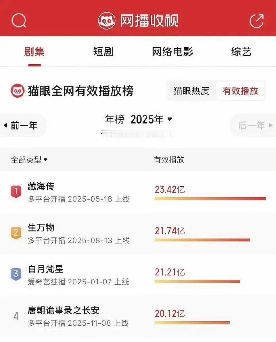 肖战藏海传可以确定云合年冠吗《藏海传》不仅是云合总播放量年冠,更是猫眼还有灯塔外加云合3榜年冠剧王,全是【官方榜单】,不是什么粉丝自制小表格哦,更可贵的是,优酷的日活比红果还低,只有腾讯爱奇艺的一半,《藏海传》40集但热播期38天,2025年内娱唯一的一部热播期短于集数的长剧,什么含金量还用说吗