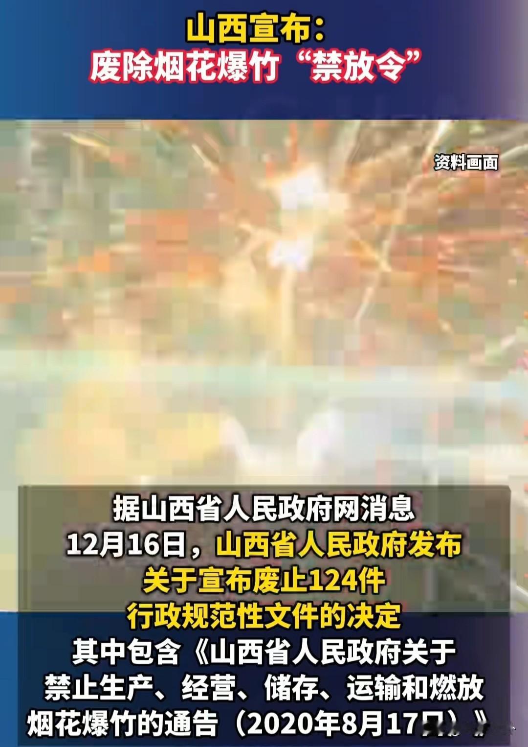 山西废止烟花禁放令:年味回归与治理升级并行 12月16日,山西废止2020年烟花禁放令,引发热议。这绝非“一放了之”,而是治理理念的转变。 当年禁放是形势所需,高楼密集易引发火灾、伤人事故,也能减少空气污染。但禁令之下,年味渐淡,文化记忆的缺失让不少人遗憾。 此次废止不是撤防,而是政策系统性清理。山西早已完善生产、运输、销售全链条许可管控,后续大概率会划定指定区域、限定节日时段燃放,同时推广环保型烟花。 这是全国“禁改限”趋势的缩影,既回应群众对年味的期盼,又守住安全环保底线。关键在于把“规范燃放”落到实处,让烟花绽放的喜悦,不变成安全隐患。