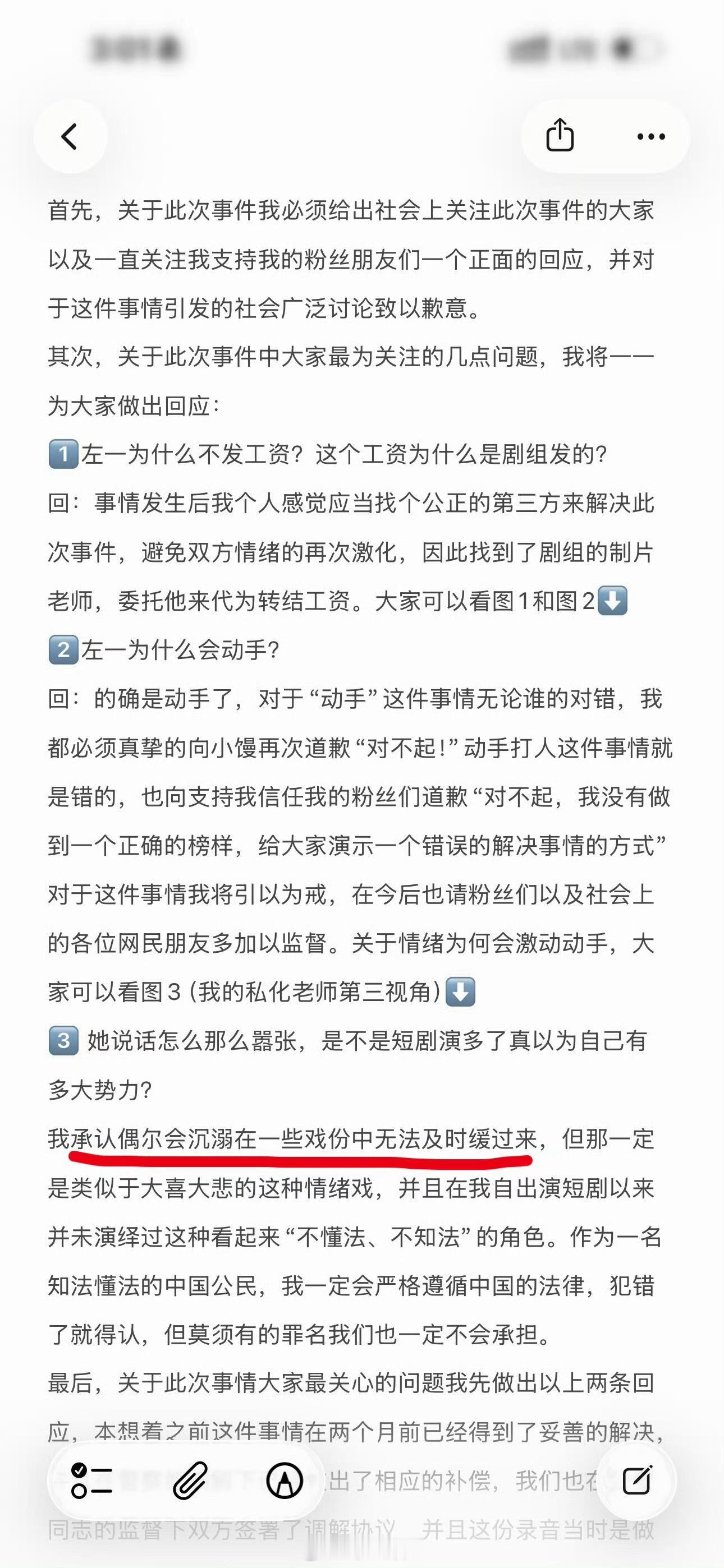 左一发文道歉省流版:人打了工资欠了但还了,现在想继续拍戏因为上热搜了所以出来道歉了 她表示两个月前已经解决并发放工资加赔偿,录音当时做出了删除处理! 左一为打助理道歉