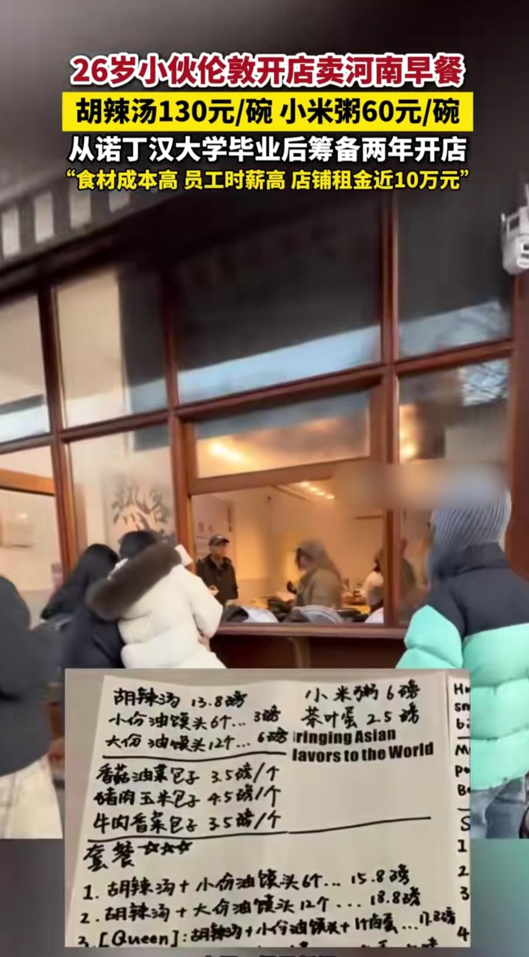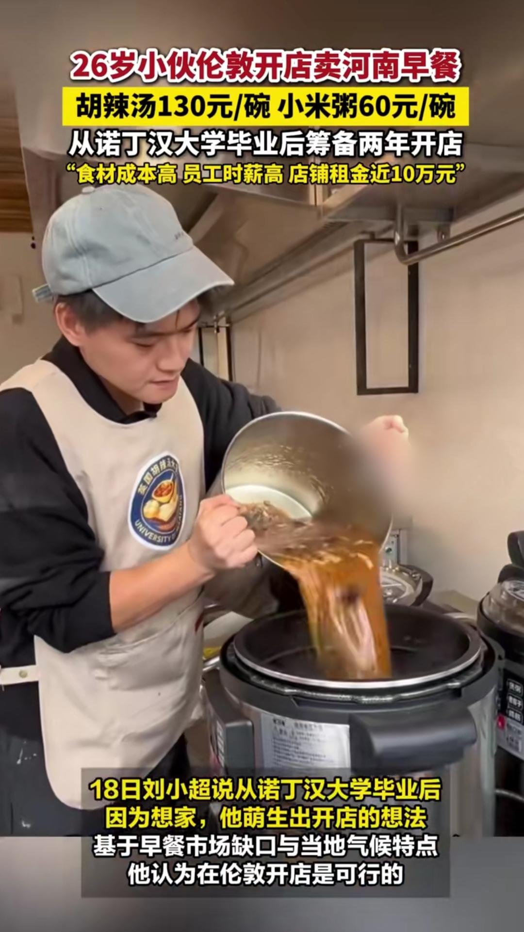 刷到伦敦这家河南早餐店,我直接破防了!26岁郑州小伙刘小超,诺丁汉大学硕士毕业,却在伦敦市中心开起早餐铺,胡辣汤130元一碗、小米粥60元,居然天天爆满,三分之二华人、三分之一外国人挤着打卡,这碗天价家乡味到底藏着什么魔力? 其实这哪是卖早餐,分明是在海外种乡愁。留学时想念妈妈做的胡辣汤,他筹备两年,从国内空运食材,扛着近10万月租金和高时薪成本,硬是不改配方,就为留住那口地道河南味。对海外华人来说,这碗胡辣汤喝的是思念,是漂泊异乡的归属感。 更难得的是,他还借着美食当文化使者。外国顾客好奇地学着配油条、品胡辣汤,听他讲河南的饮食故事。130元的定价背后,是食材的成本,是对传统的坚守,更是文化输出的底气。乡愁从不是负担,而是让传统文化走向世界的桥梁。 你觉得130元一碗胡辣汤贵吗?如果在海外遇到家乡味,你会果断打卡吗?评论区聊聊!