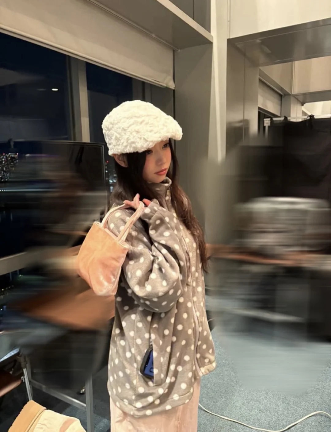 moka的冬日穿搭真的长在萌点上了!两套look各有各的可爱~ ✨穿搭思路拆解: 1. 街头甜酷风:黑色羽绒服简约又保暖,黄条纹围巾是点睛之笔,不仅中和了黑色的厚重感,还让整体造型多了几分元气,扎起的半丸子头搭配黑框眼镜,少女感直接拉满。 2. 慵懒软糯风:波点摇粒绒外套选宽松版型,对身材的包容性超赞,搭配毛绒贝雷帽营造出慵懒氛围,浅粉色下装和焦糖色包包的搭配,让浅灰色系的穿搭多了温柔的层次感,软萌值拉满