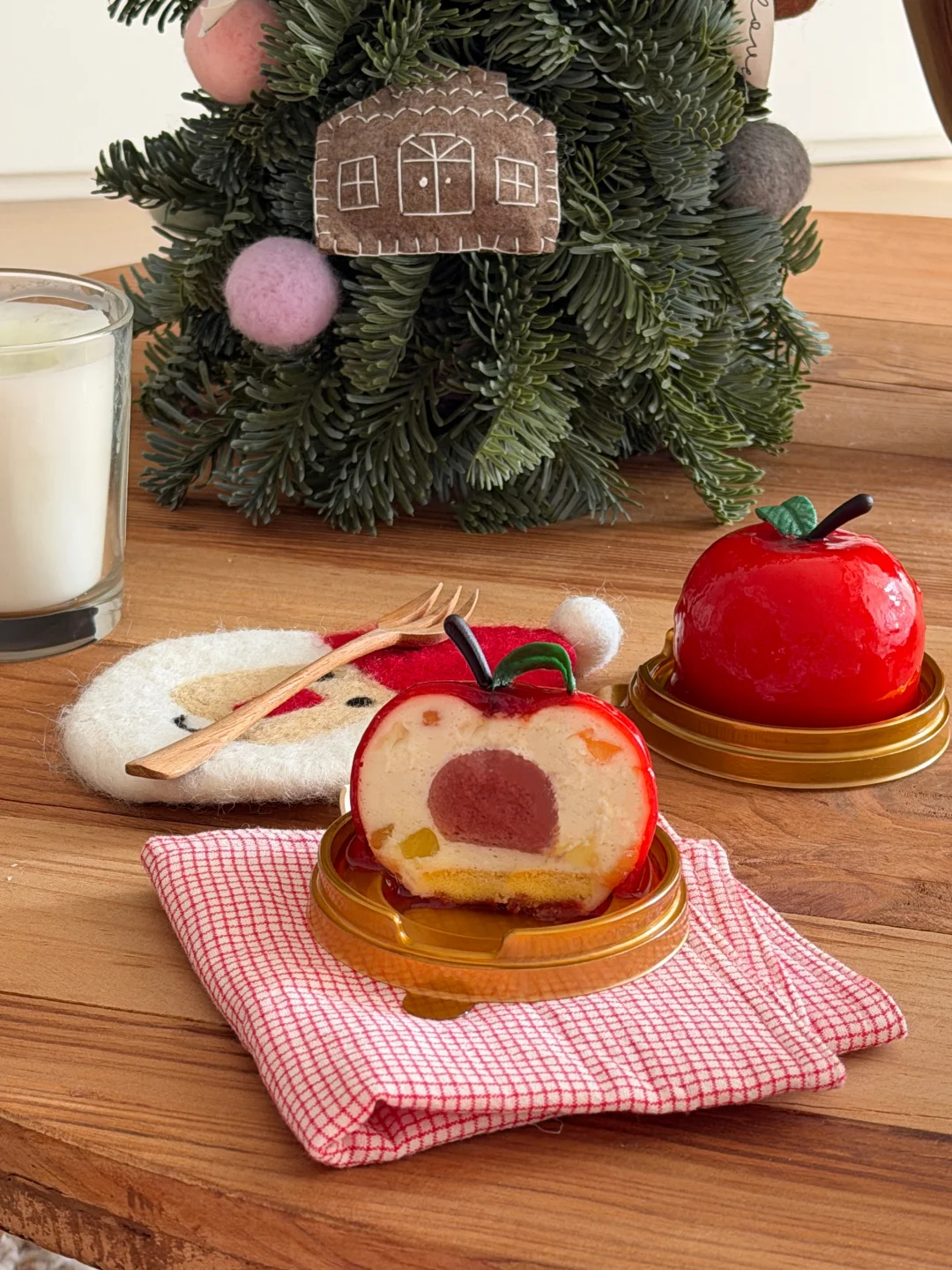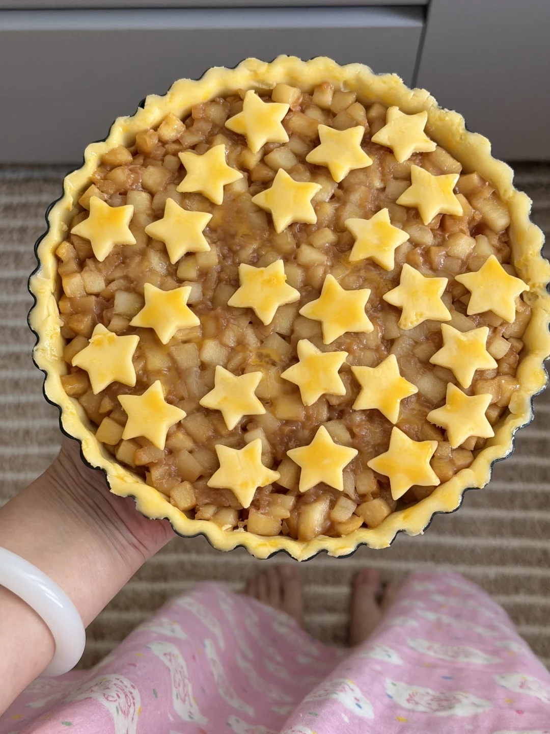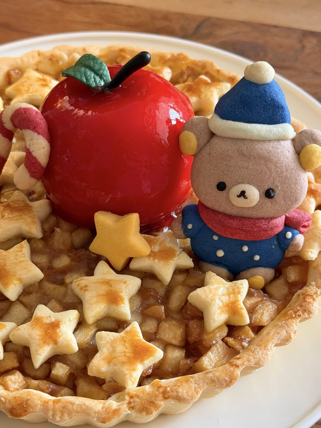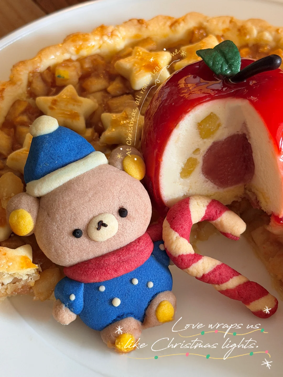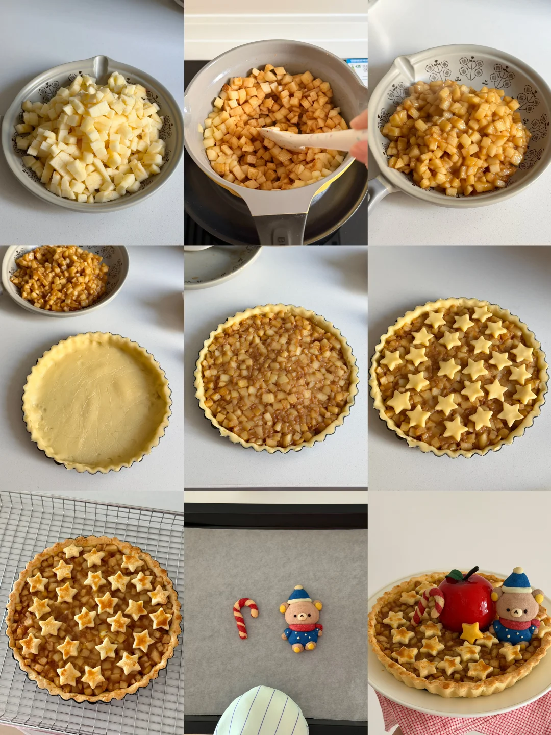 今年圣诞餐桌的绝对C位—— 自制轻松熊苹果派 🥧× 元祖苹安果🍎 一个亲手制作,一个精致馈赠 组合出了双倍温暖的节日仪式感🎄 满足了甜品脑袋对圣诞餐桌的所有遐想~ 所需食材: 黄油100g,糖粉 50g,盐1g,低筋面粉 170g,常温全蛋液25g左右,苹果3个,水淀粉少许 制作步骤: 1️⃣软化的黄油中筛入低筋面粉,盐和10g糖,搓成细颗粒状, 2️⃣加入蛋液,揉匀,用保鲜膜包裹面团,冰箱冷藏进行松弛。 3️⃣锅中放入10g 黄油,加入切好的苹果丁,25g细砂糖,肉桂粉适量(根据个人喜好)炒软,加少许水淀粉勾芡。苹果馅料制作完成! 5️⃣取出面团,三分之一擀平放入模具中做派底,加入苹果酱。剩余面团擀平,用星星模具压出星星⭐形状,盖在派🥧上,最后剩下的面团调色后捏出轻松熊和圣诞拐杖饼干(单独150°烤20分钟) 6️⃣苹果派刷蛋液,烤箱预热200°烤25分钟 7️⃣出炉后摆上美味的元祖苹安果和提前做好的饼干🍪 快来试试吧~超满足的!! 苹安果的外皮是树莓果酱淋面,中间层的慕斯裹着脆爽的大颗青苹果肉,酸中带甜![哇R] 还有草莓果泥夹心,让整颗慕斯口感层次变得超丰富 放在苹果派上,一整个圣诞氛围拉满了~ 这个圣诞节创造专属自己的餐桌氛围感吧! 而且它家全国780+门店,7公里内2小时就能配送到家~超省心的![点赞R]