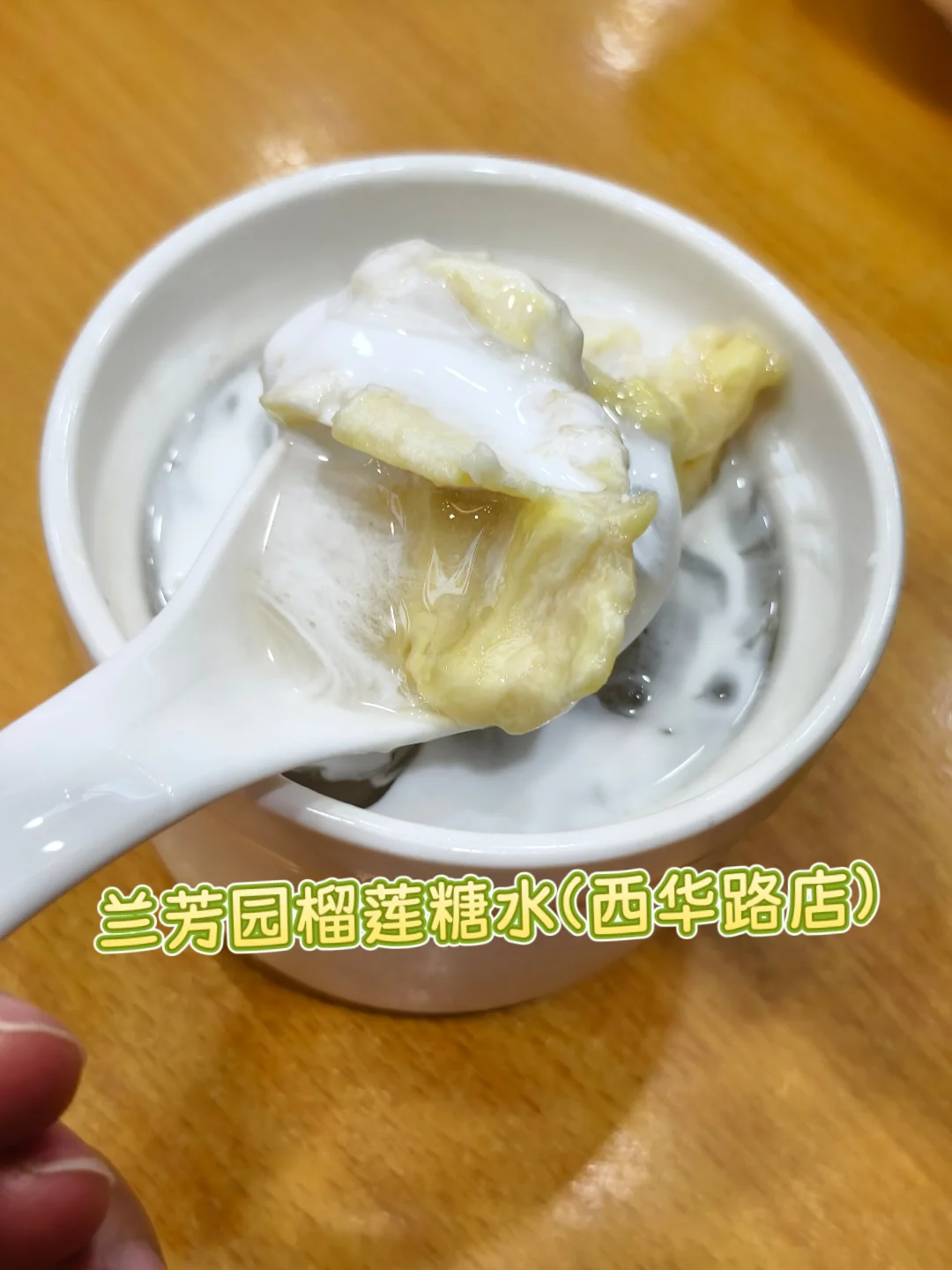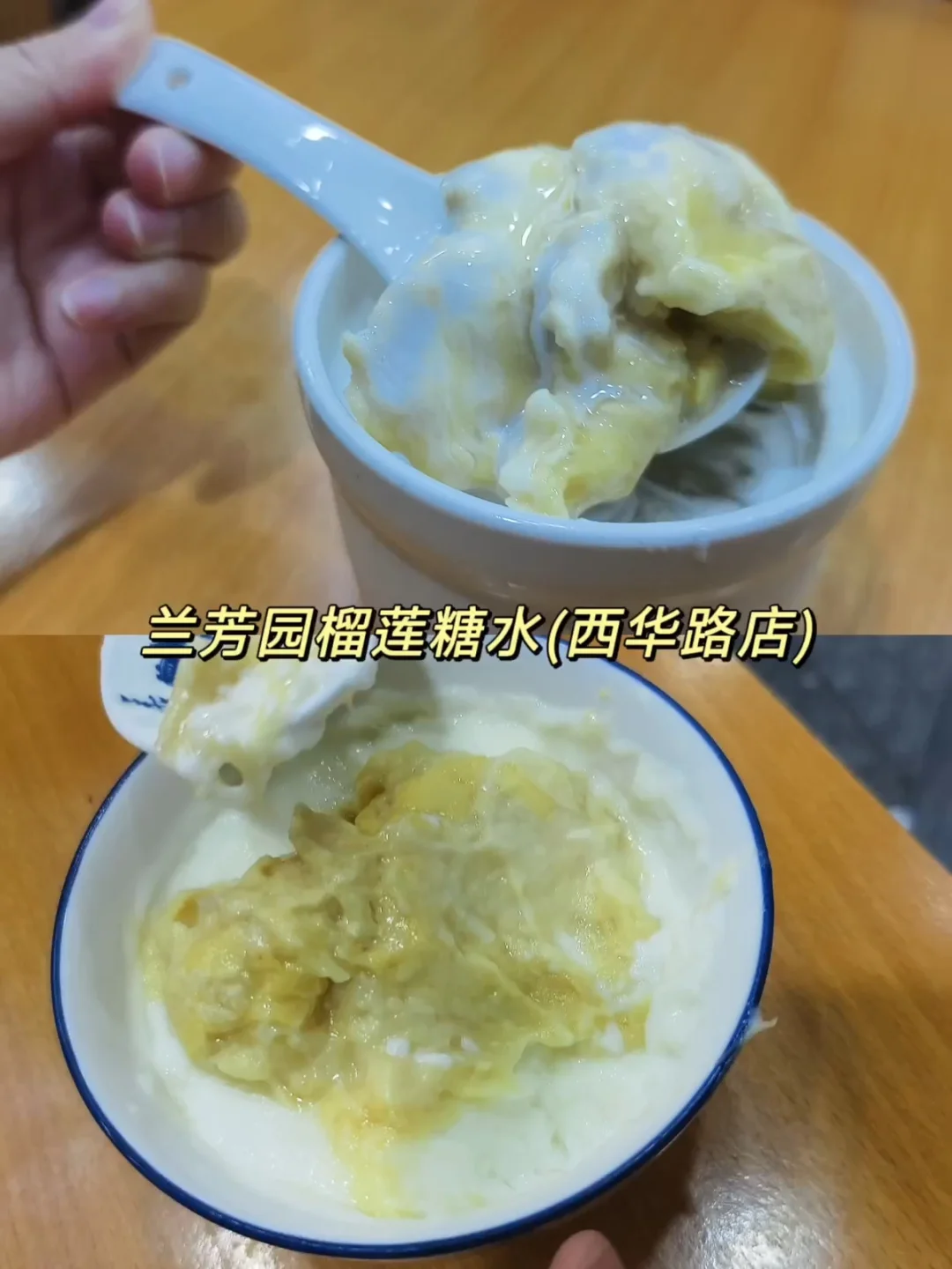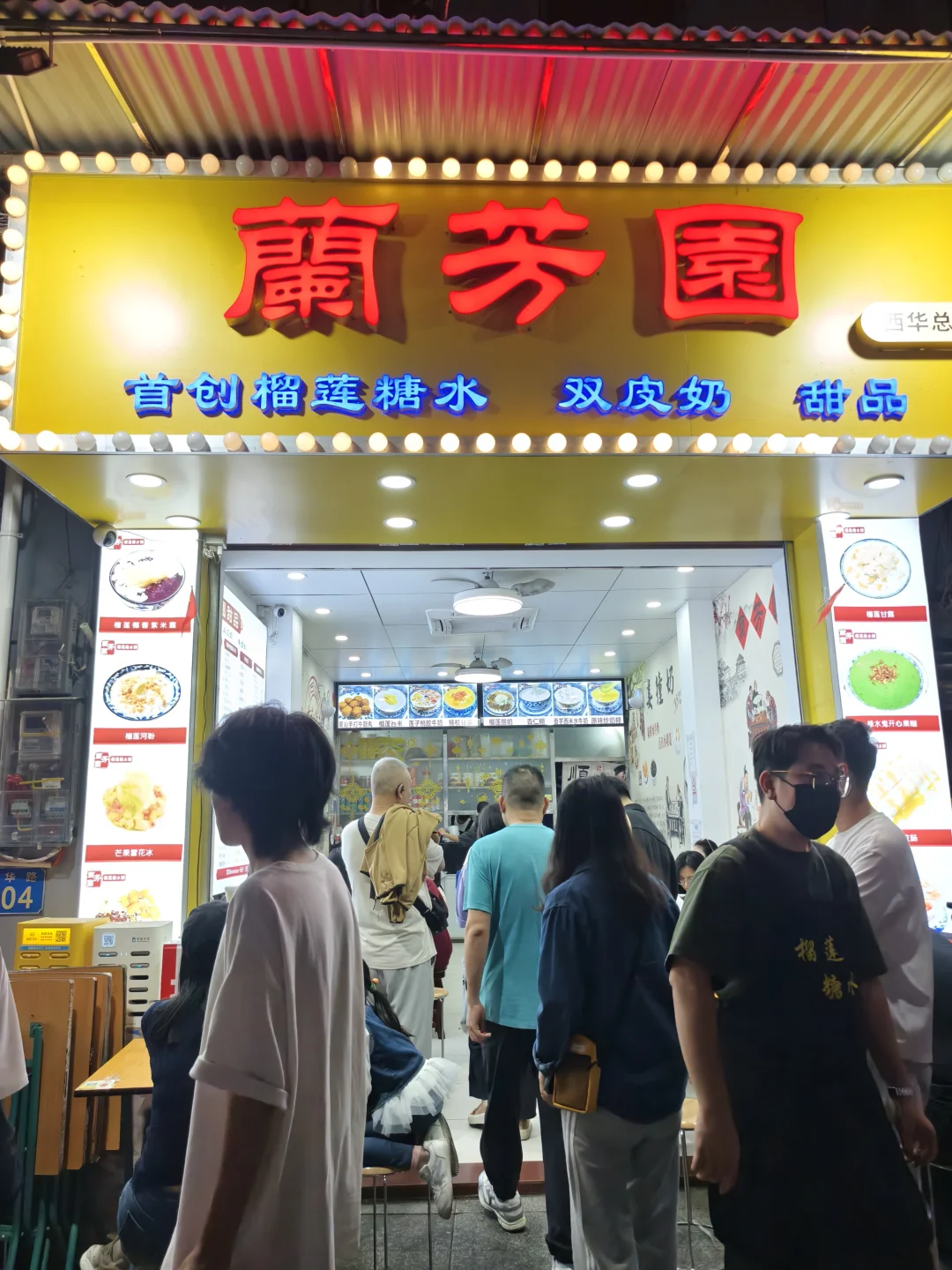 兰芳园榴莲糖水,比较有名气的榴莲糖水,红豆榴莲,招牌椰香榴莲,感受榴莲的另一种吃法,女生吃完会尖叫啊,现场女生排队超多。