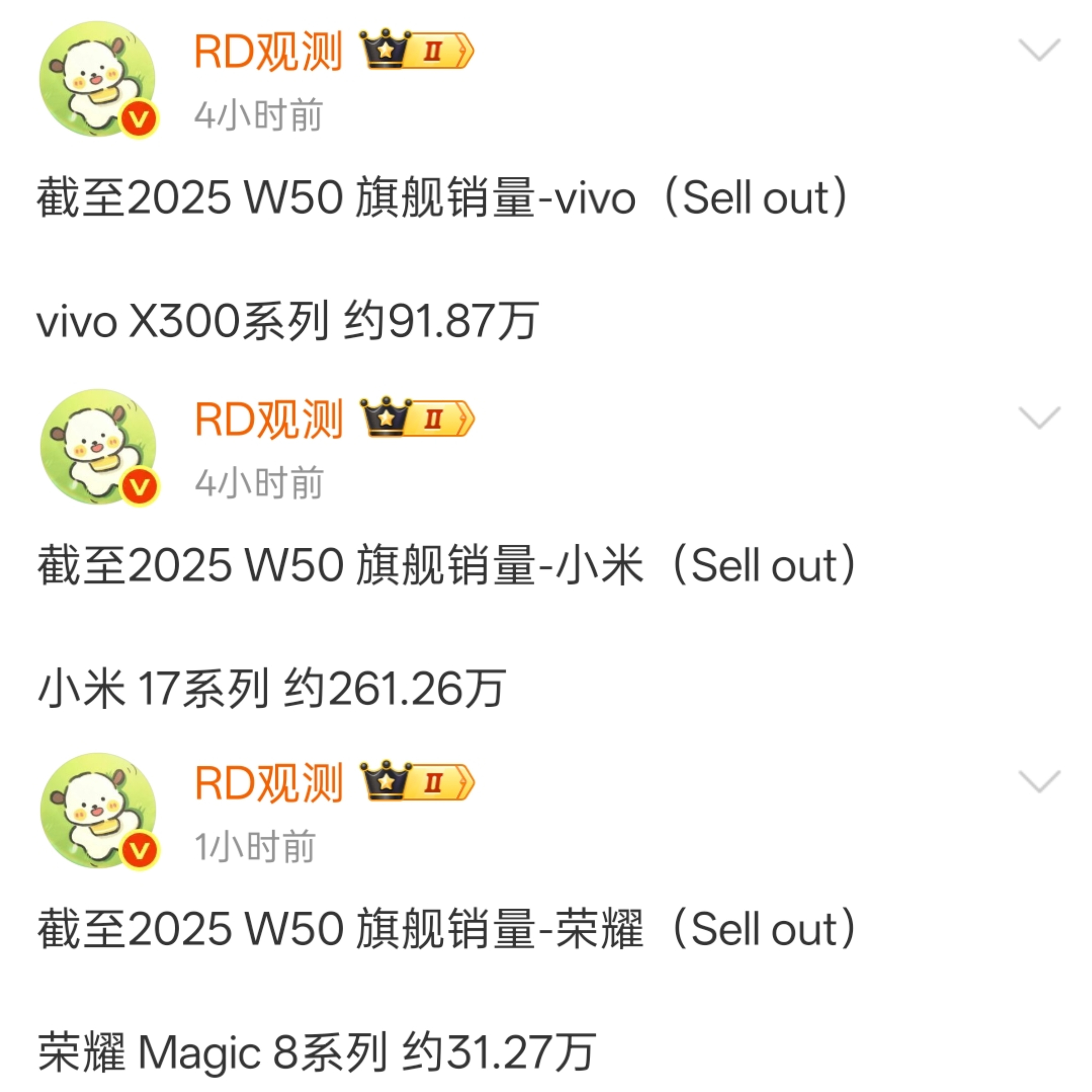 据RD观测公布各家旗舰销量数据如下,感觉如何?iPhone 17系列 约1141.57万台Mate 80系列 约100.68万台OPPO Find X9系列 约70.1万台vivo X300系列 约91.87万台小米17系列 约261.26万台荣耀Magic 8系列 约31.27万台