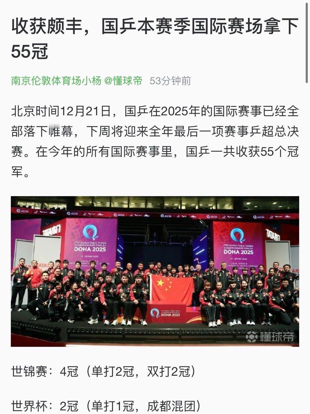 国乒本赛季国际赛场55冠55冠耀世!国乒以专业与传承铸就新传奇2025年国际乒坛的大幕缓缓落下,55座冠军奖杯的璀璨光芒,为中国乒乓球队的本赛季写下了最磅礴的注脚。世锦赛上,王楚钦、孙颖莎摘得单打桂冠,孙颖莎/王楚钦、王曼昱/蒯曼包揽双打金牌,4冠彰显硬核实力;成都混合团体世界杯与亚锦赛男团、女团的3座团体奖杯,见证着团队协作的无懈可击。在竞争激烈的WTT赛场,4站大满贯豪取16冠,6站冠军赛斩获8座单打金杯,支线赛至球星挑战赛的各层级赛事中,国乒选手同样势不可挡,将12座支线赛冠军、3座球星挑战赛冠军与5座常规挑战赛冠军收入囊中。