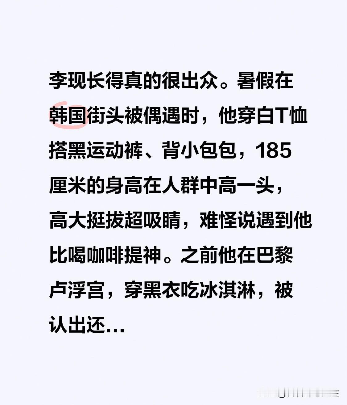 李现长得真的很出众。暑假在韩国街头被偶遇时,他穿白T恤搭黑运动裤、背小包包,185厘米的身高在人群中高一头,高大挺拔超吸睛,难怪说遇到他比喝咖啡提神。之前他在巴黎卢浮宫,穿黑衣吃冰淇淋,被认出还害羞低头,和荧幕形象不同。 他长相不是小鲜肉的俊美,而是阳刚风,寸头搭分明五官很有魅力。2024年他主演《春色寄人》获提名,《国色芳华》里古装造型惊艳,身姿挺拔似画中公子。他表演细腻有层次,这样的李现,出众没话说! 李现 李现演技 李现广告代言 明星 [送自己一朵花][送自己一朵花][送自己一朵花]