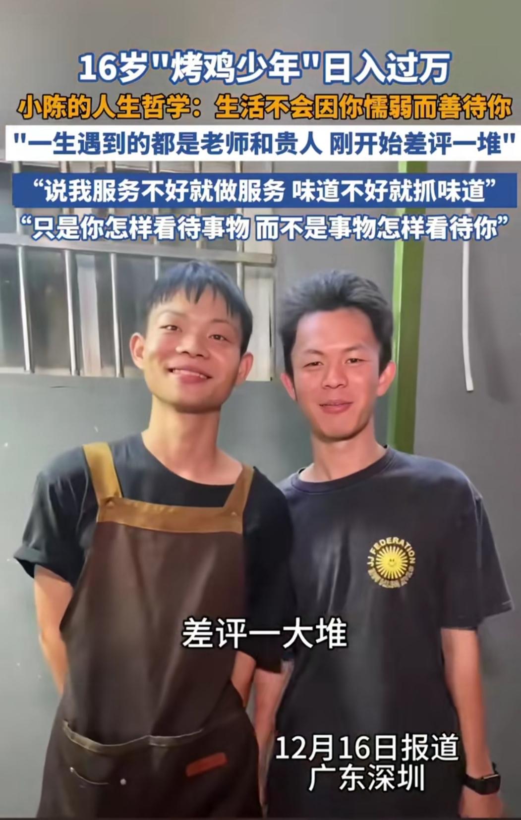 刷到16岁少年烤鸡日入过万的新闻时,我第一反应不是羡慕,而是愣了神——当同龄孩子还在为月考烦恼、围着操场跑圈时,这个少年已经站在烤炉前,用翻烤鸡翅的手撑起了自己的小事业。有人说他运气好,赶上了餐饮旺季,可谁也没看到他凌晨备料、深夜收摊的模样,这份“日入过万”的背后,哪有什么轻松的捷径。 其实这不是简单的“少年创业成功”故事,而是当下年轻人另一种生活选择的缩影。他没有按部就班走升学的路,却用双手把烤鸡摊做成了“爆款”,这份对生计的清醒、对做事的踏实,比数字更打动人。 我们总说青春有千万种模样,有的在课堂里汲取知识,有的在烟火气里打磨技能。只要是认真生活、努力向前,无论是伏案苦读还是掌勺摆摊,都是值得肯定的青春姿态。