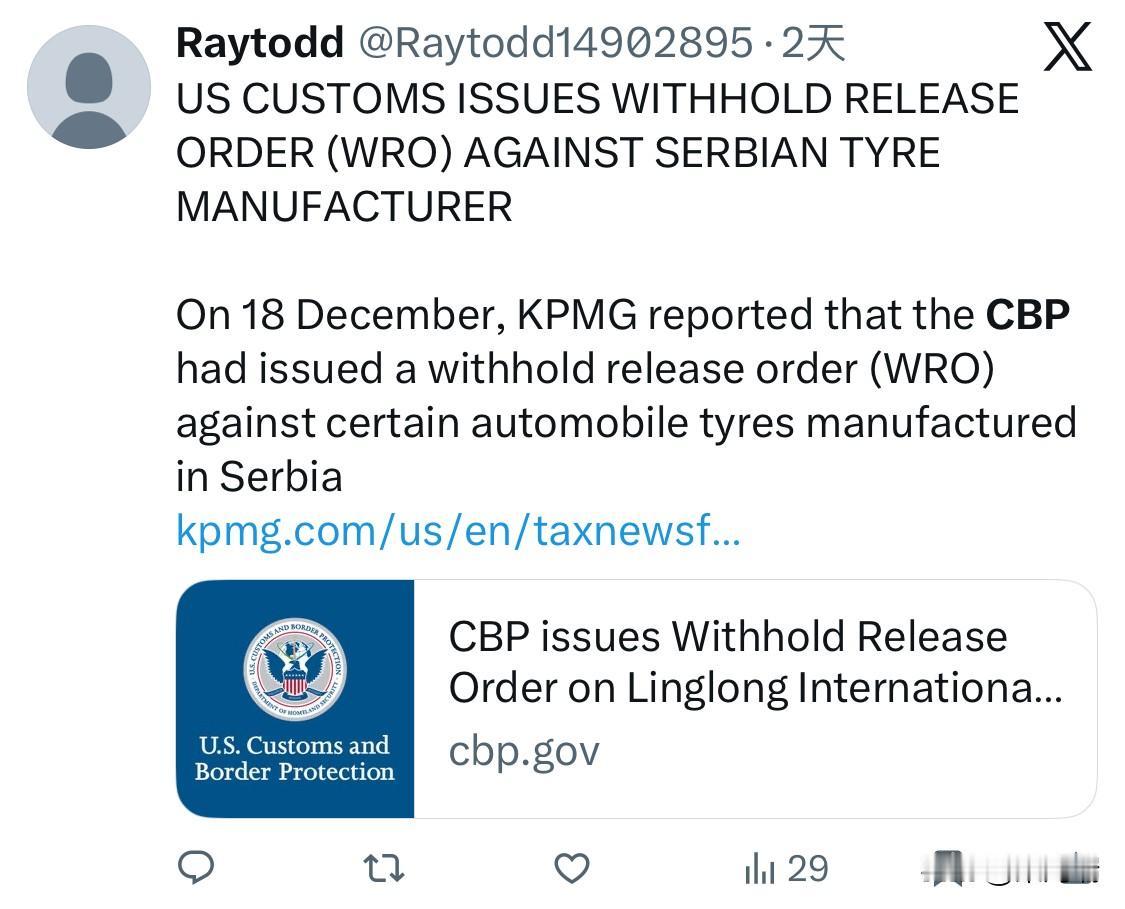 美国海关和边境保护局 (CBP) 对中国控股的玲珑国际欧洲有限公司 (Linglong International Europe DOO Zrenjanin) 在塞尔维亚生产的汽车轮胎发布了暂扣放行令 (WRO)。
