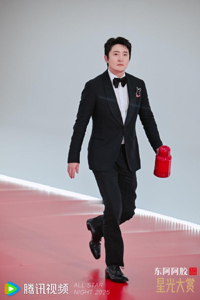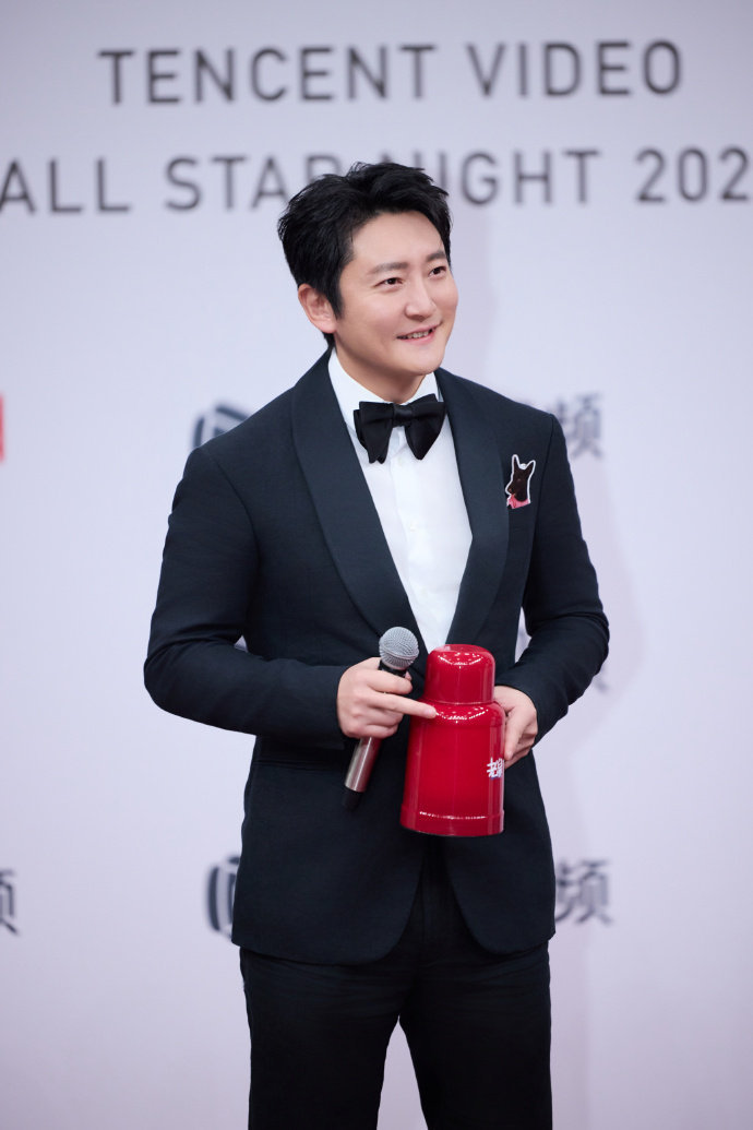 郭京飞左手驻站右手老舅 星光大赏现场,郭京飞左手红壶与《老舅》相映,右肩依卡和《驻站》相衬,这搭配超亮眼!