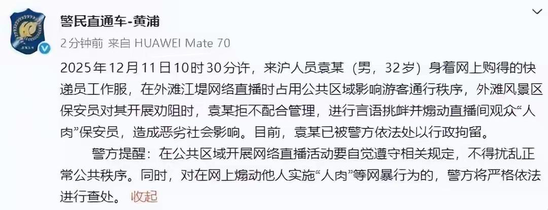 净网重拳:外滩直播滋事者被依法行政拘留 近日,上海外滩一男子直播期间,公然煽动粉丝人肉搜索现场保安,造成恶劣社会影响。警方接报后迅速介入,依法对该男子作出行政拘留处罚。此举彰显净网整治的坚定决心,警示网络绝非法外之地,直播言行必须恪守法律边界,任何煽动网暴的行为都将难逃严惩。