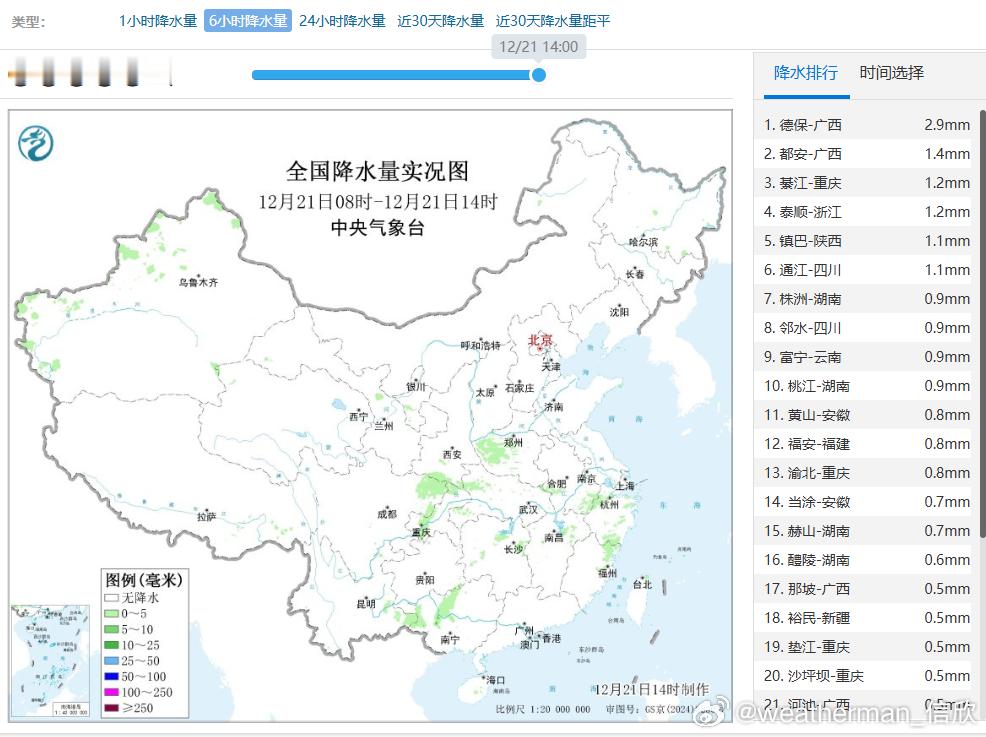 【降水和干燥】今天白天,北方多地依然干燥。14时,北京、天津西青、辽宁锦州相对湿度只有18%。南方之前有降水,相对湿润,不过今天白天降水也呈现缩减趋势。今天下午到明天中午,南方可能还有零散的降雨,降雪主要在新疆西部和北部,局地有大雪或暴雪。