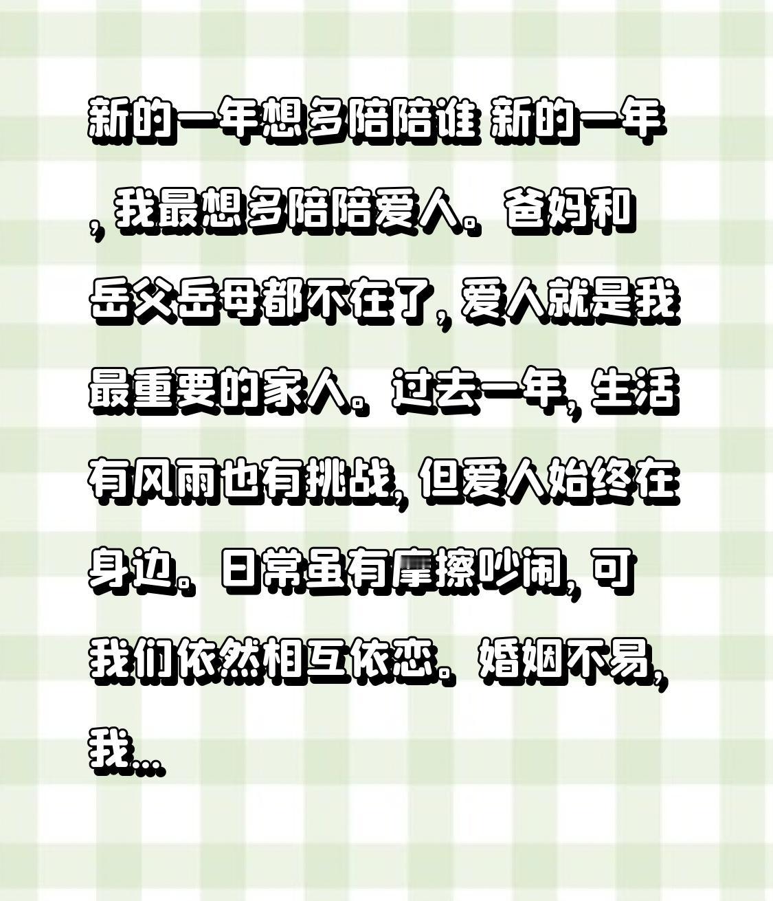新的一年想多陪陪谁 新的一年,我最想多陪陪爱人。爸妈和岳父岳母都不在了,爱人就是我最重要的家人。过去一年,生活有风雨也有挑战,但爱人始终在身边。日常虽有摩擦吵闹,可我们依然相互依恋。婚姻不易,我们更应相互体谅。在这团圆时刻,我想多给爱人温暖与陪伴。未来日子,不求大富大贵,只愿在柴米油盐里,与爱人携手相伴,珍惜每一刻。