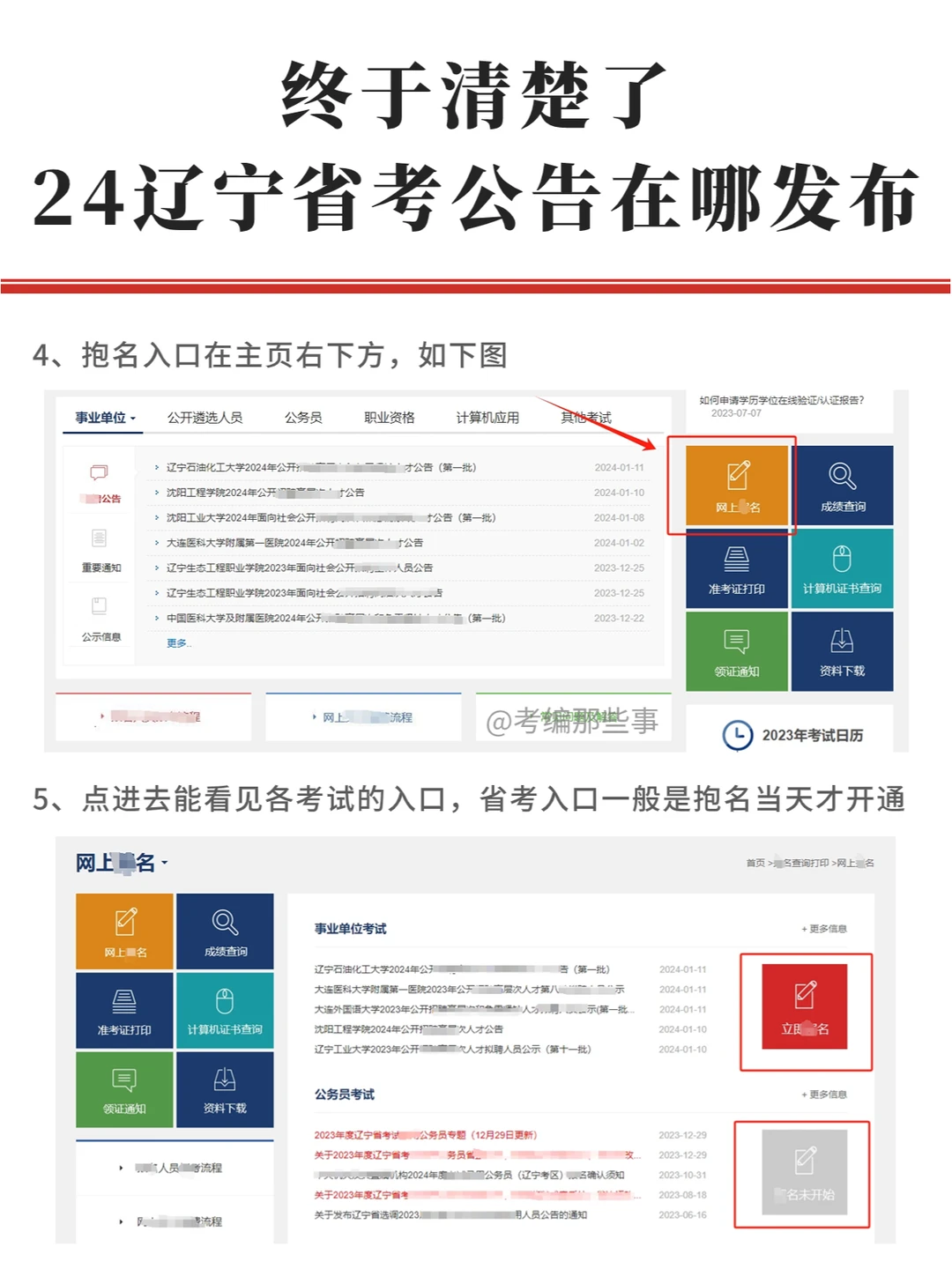 辽宁省考去年是1月17日出的,感觉今年公告也要中旬或下旬,大家先了解一下2024的公告和岗位在哪里看叭~ . [大笑R][大笑R]2024辽宁省考公告和岗位怎么看? 1、公告发布网站:辽宁人事考试网 浏览器搜索“辽宁人事考试网”,带绿标的 2、公告发布后,“通知通告”栏就能看到公告 3、点进公告,滑到底部,就可以下载岗位表,抱考指南的话不在公告底部,而是单独发一条通知 4、省考的抱名入口在主页右下方 5、点进去能看见各考试的入口,省考入口一般是抱名当天才开通