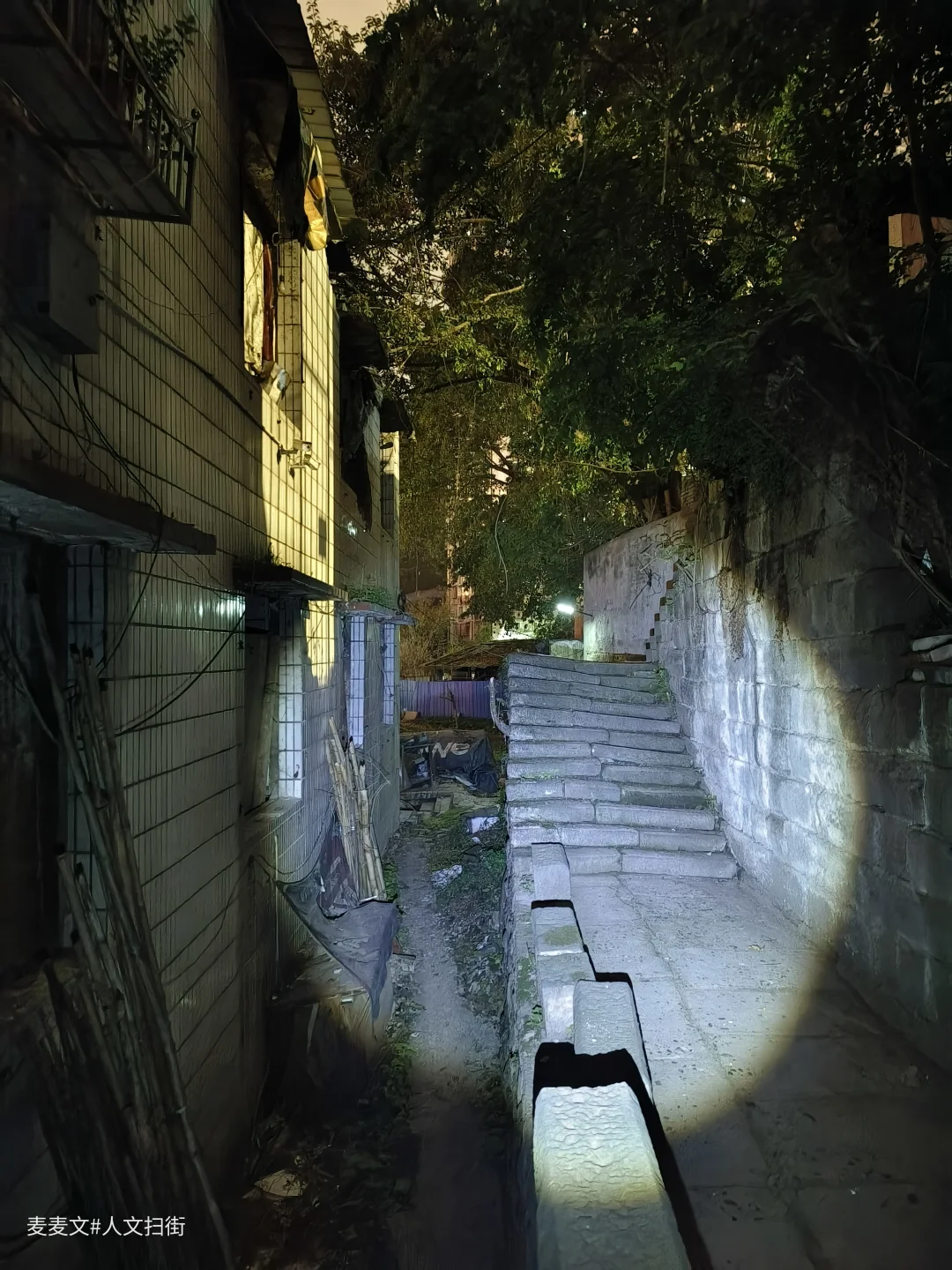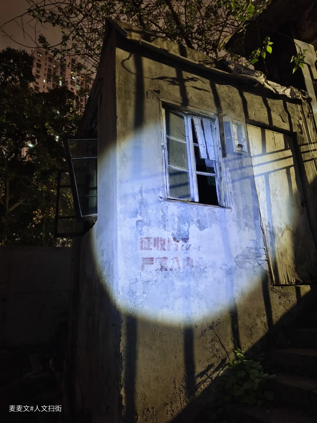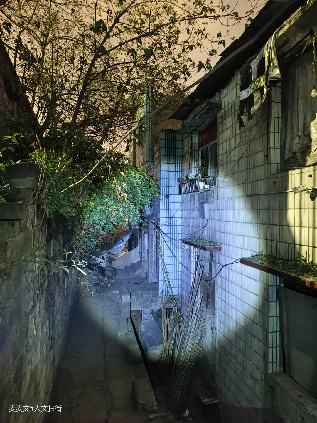 当夜幕如一张巨大的黑幕缓缓降下,城市的喧嚣逐渐被黑暗吞噬,我怀着一丝忐忑与好奇,踏入了重庆市渝中区王家坡那片征收区域。在一条不起眼的小巷深处,偶遇一废弃老厂,四周被杂乱的树木和破败的围墙环绕。 走进老厂的大门,一股铁锈味和尘土味扑鼻而来。曾经热闹非凡的工厂,如今只剩下一片死寂。昏黄的路灯在枝叶的遮挡下,投下斑驳陆离的光影,仿佛张牙舞爪的怪物影子,让人心里不禁有些发毛。
