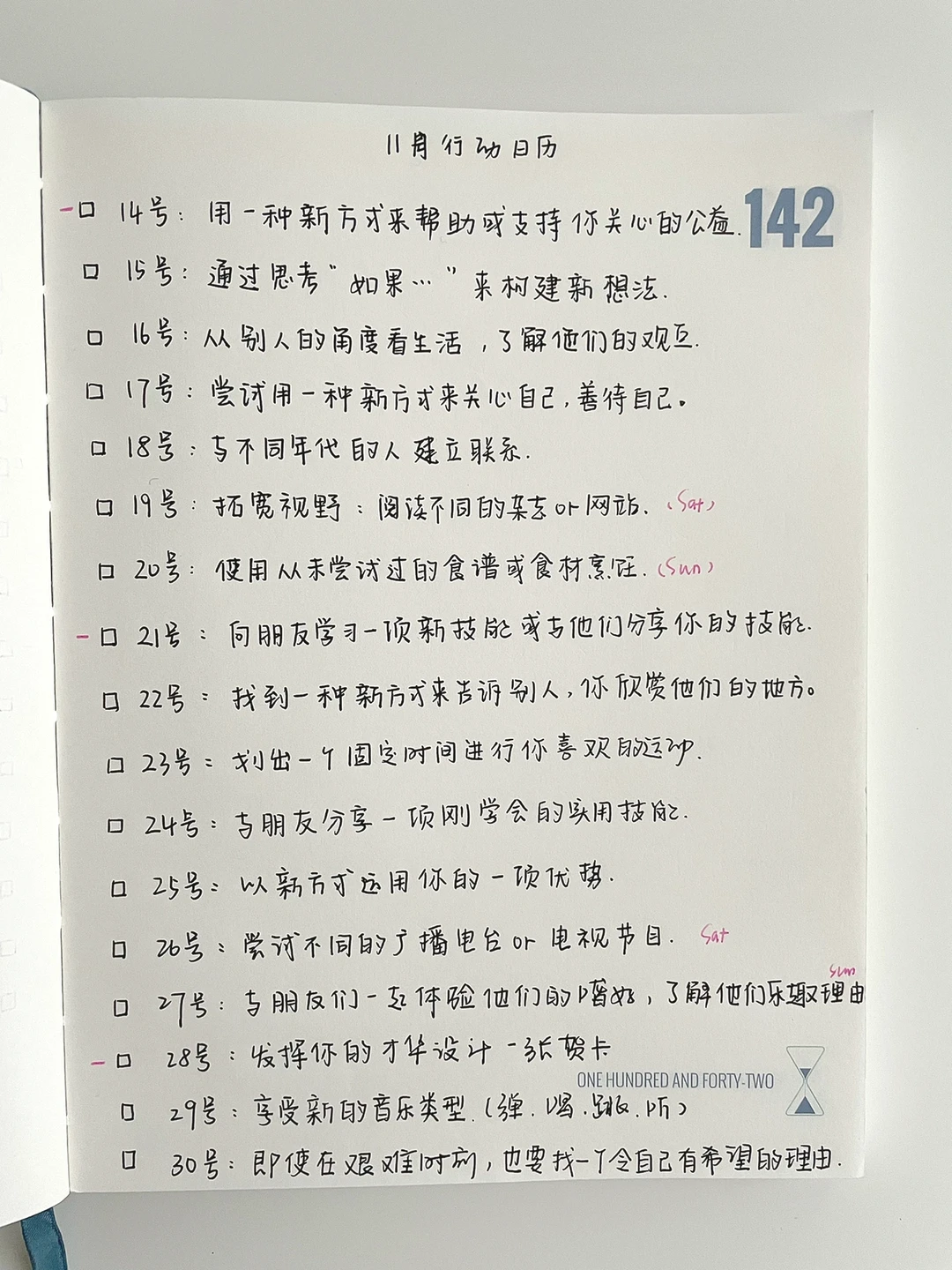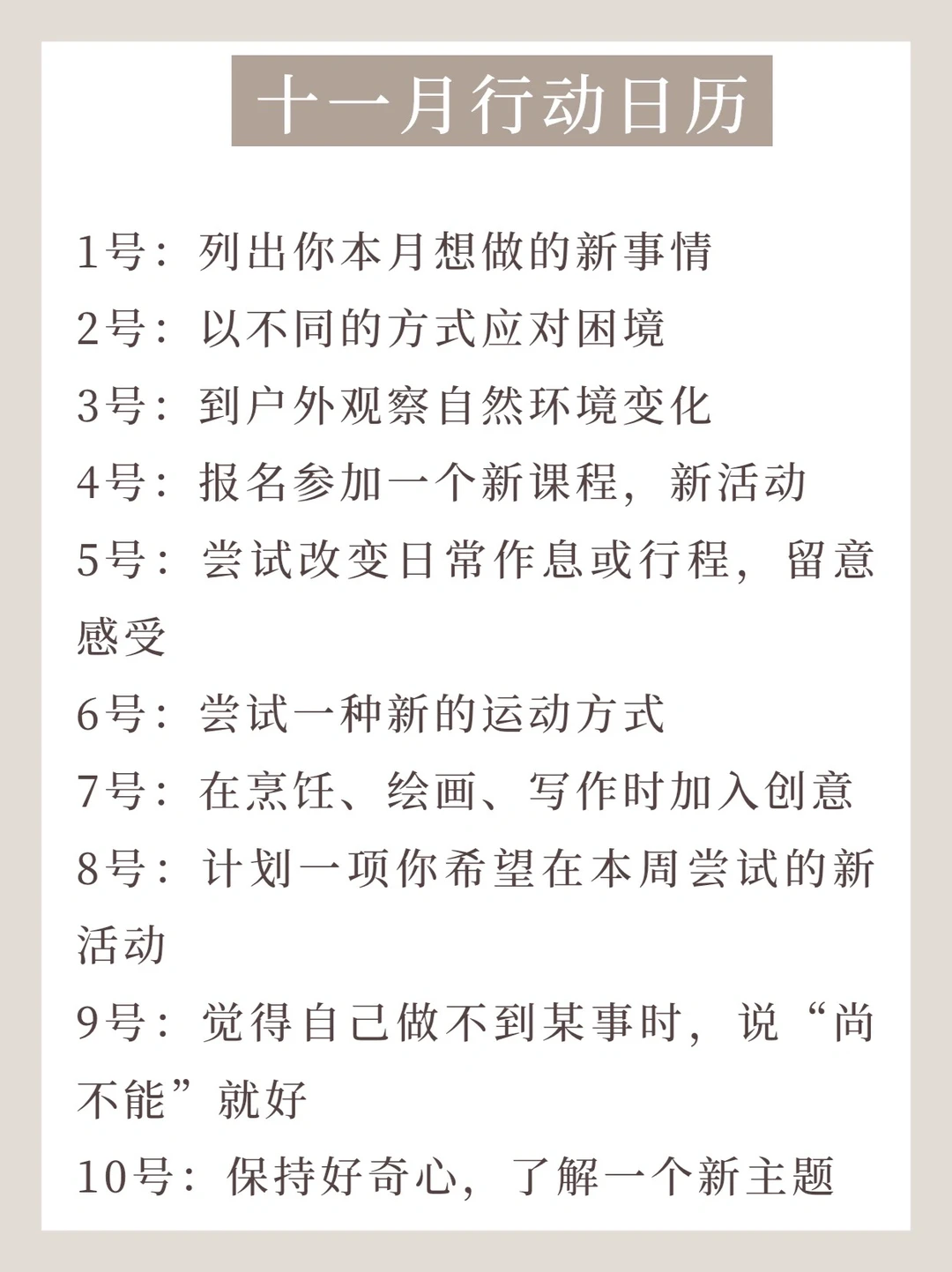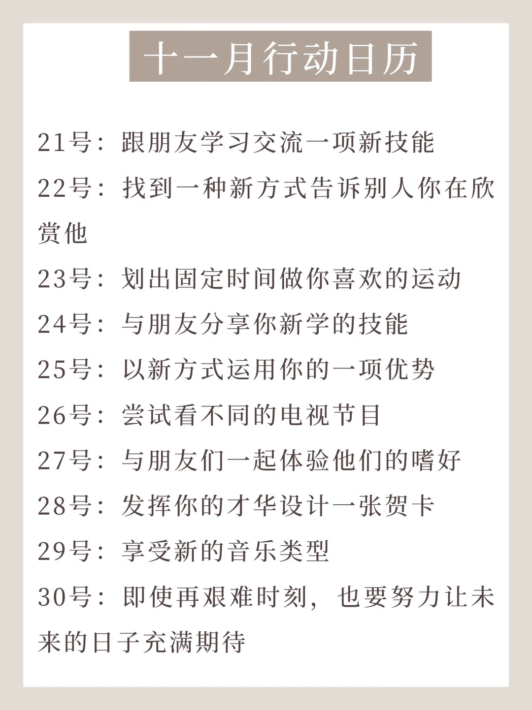 十一月,是尝试新活法的开始,以下这些小行动都可以让我们去用全新的视角获得更多一点的幸福!恰好在行动日历里,有通过研究结果列出 “幸福的十个关键词”: