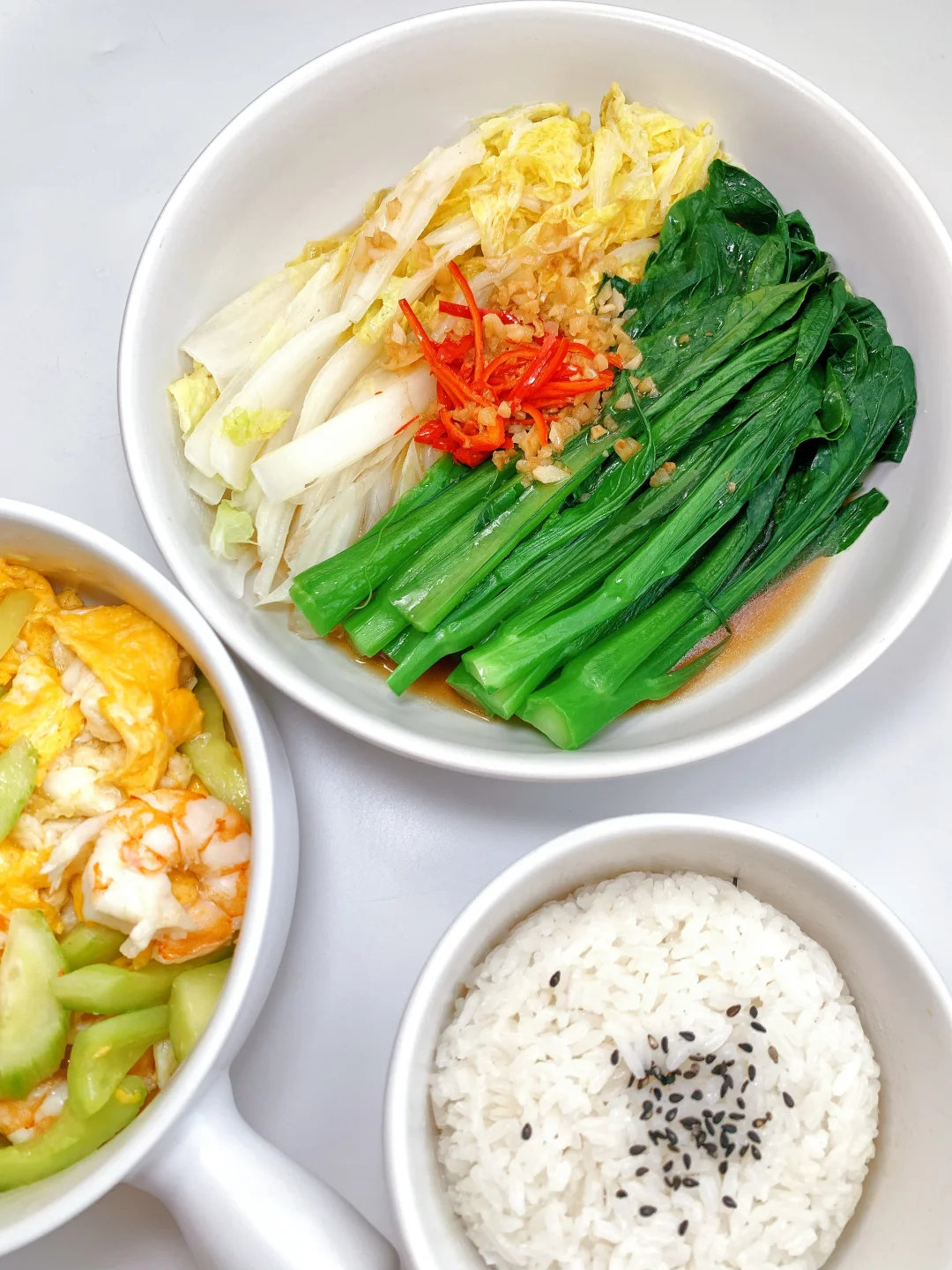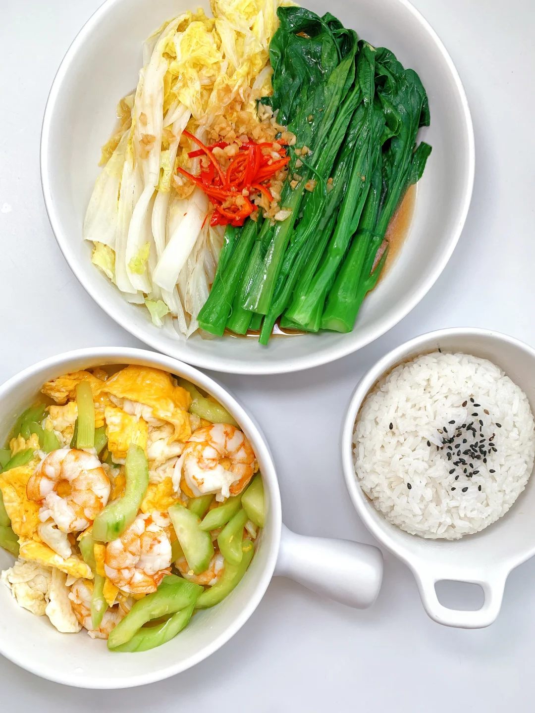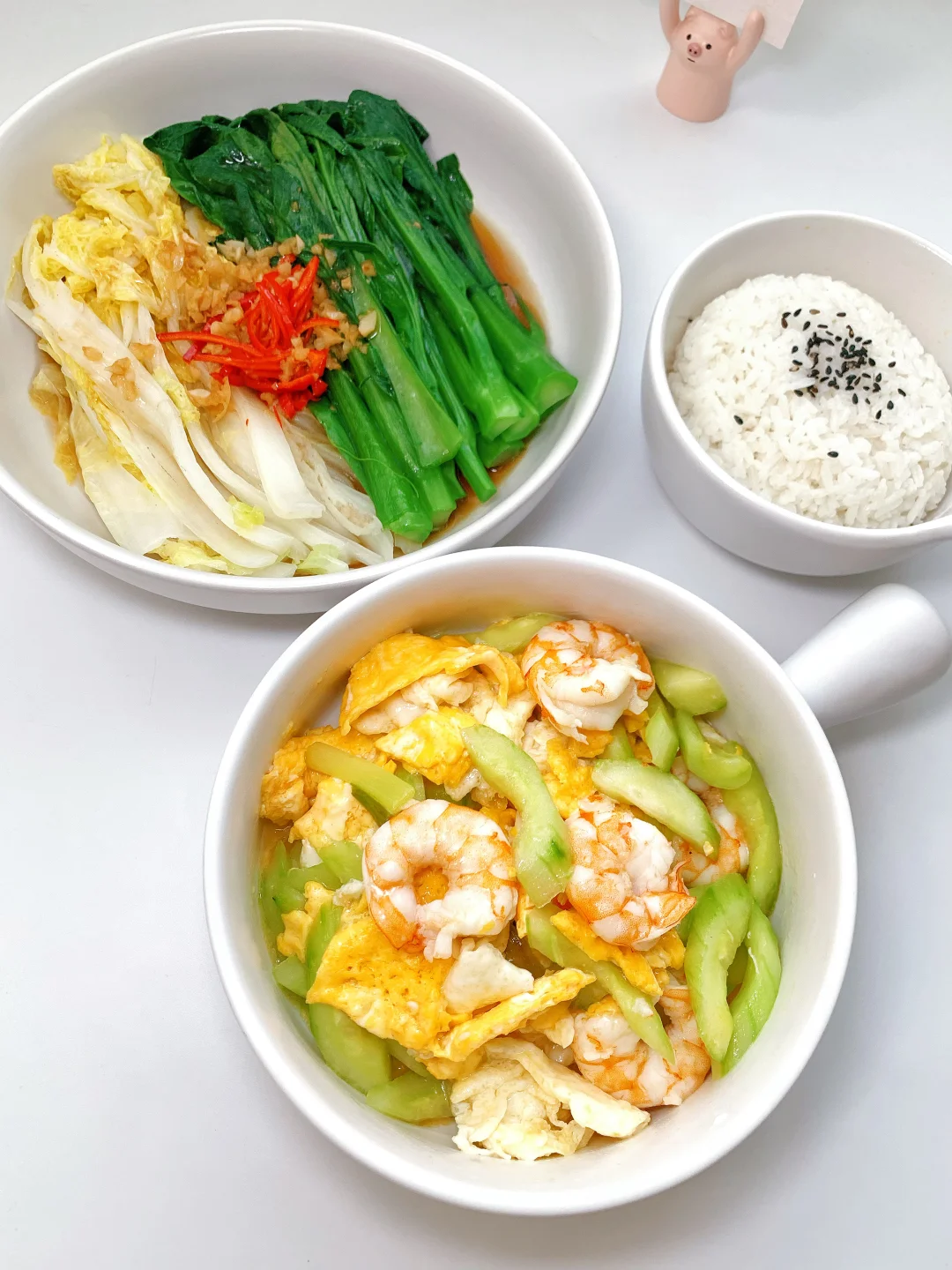 ♨️晚餐不到四百大卡,还跟我一起吃舒服干净的饭~ 今日分享: 🍖青瓜鸡蛋炒虾仁 🥬白灼娃娃菜菜心双拼 今日主食:米饭