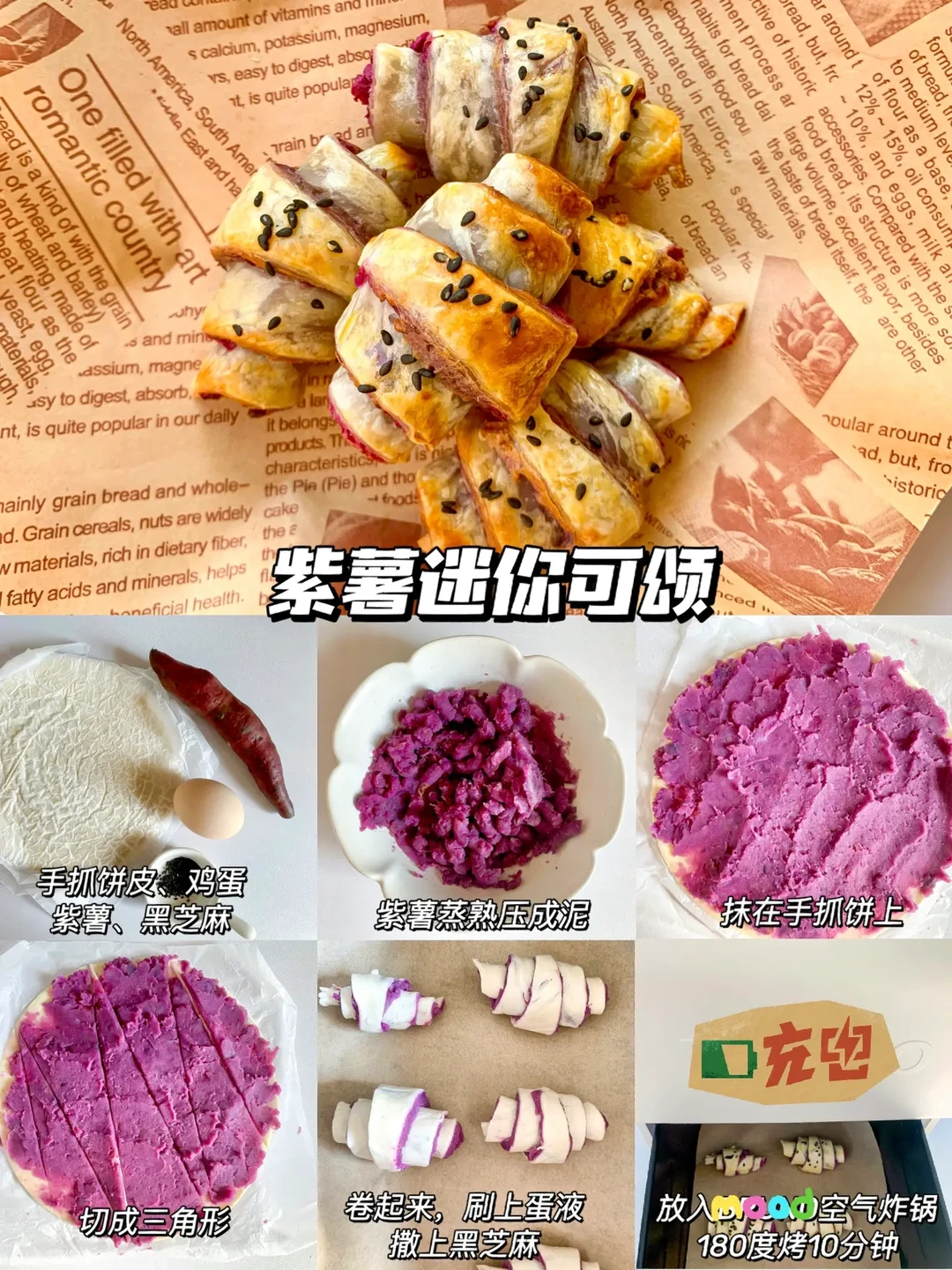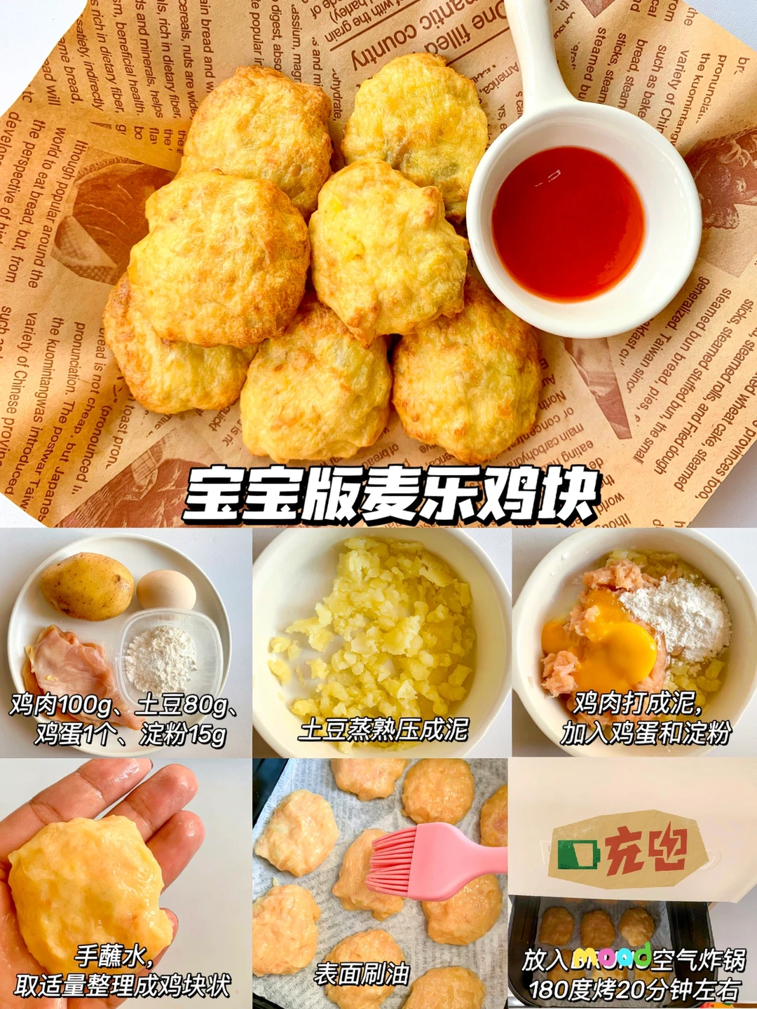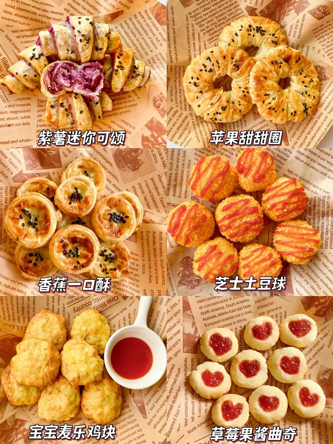 今天分享6款宝宝小零食的话作为小吃或宝宝下午茶都不错哦,非油炸更健康,快手简单0翻车,让宝宝也能拥有零食的快乐教程来啦! - ✅紫薯迷你可颂 ✅苹果甜甜圈 ✅香蕉一口酥 ✅芝士土豆球 ✅宝宝麦乐鸡块 ✅草莓果酱曲奇 - 由于空气炸锅脾气不同,时间和温度仅供参考,注意观察食物状态
