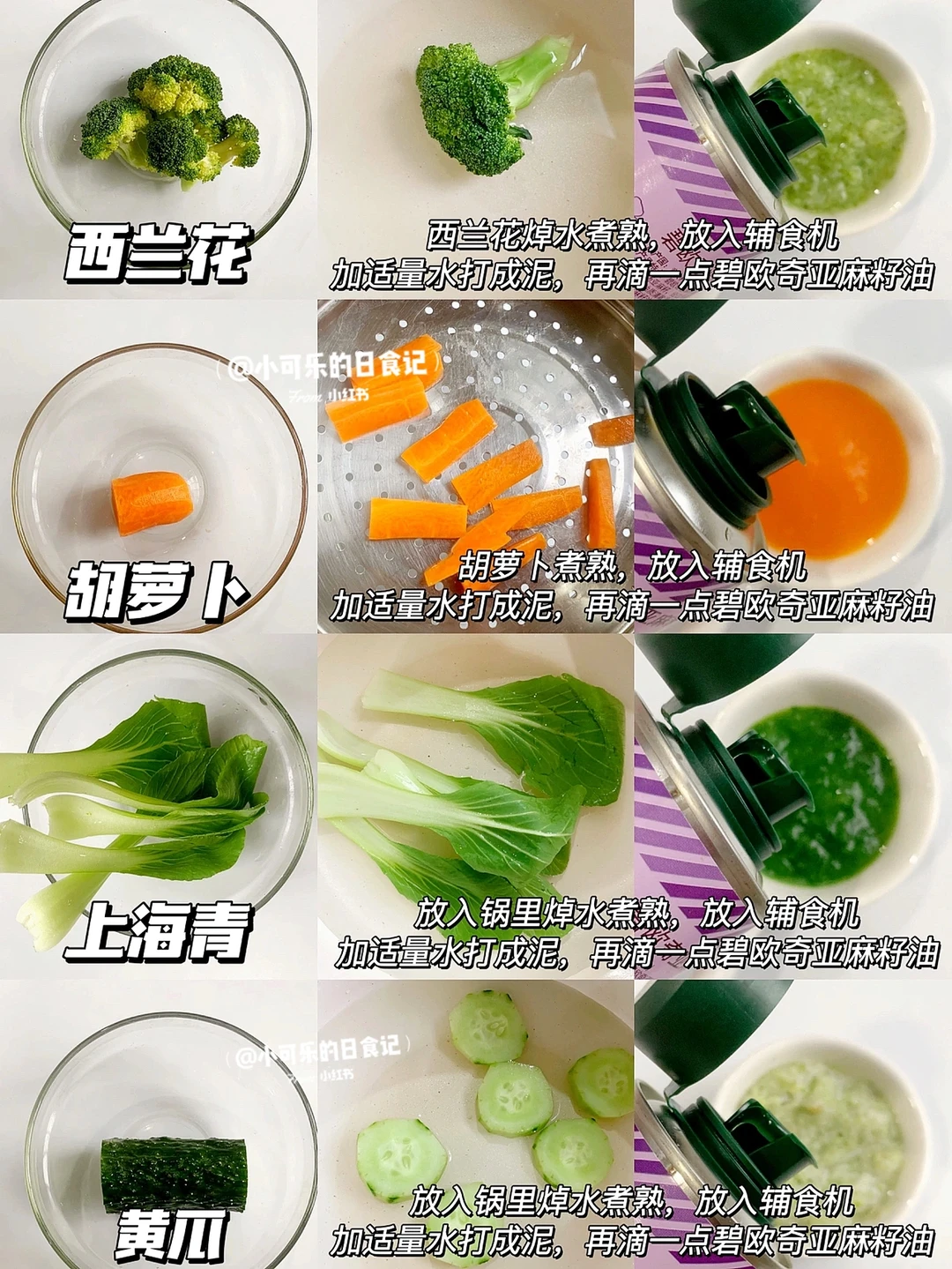 🔸根茎类蔬菜去皮切块,放入锅里蒸熟,加入少许温水打成泥,滴一点亚麻籽油