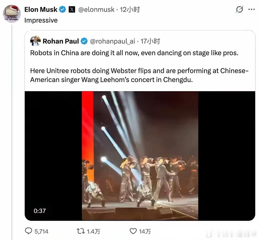 人形机器人迎多重利好,明天能否起飞?利好1、王力宏演唱会上出现了6台宇树人形机器人伴舞并完成了高难度的后空翻动作,这一消息在网上引起广泛讨论。不仅如此,马斯克居然也关注到了该视频,他在转发该视频的时候并评论称:“Impressive(令人印象深刻)!过年的时候宇树机器人尚需要搀扶,年底的时候居然已经能跳舞并完成高难度动作,国内人形机器人的发展不可谓不快!利好2、中国俱乐部自主设计制造的机器人参加了阿联酋阿布扎比举办的格斗机器人大赛并获得了冠军!格斗机器人大赛夺冠无疑证明了国内机器人水平已经是国际领先了!另一方面,人形机器人板块已经调整较长时间,多数个股已较前期高点下跌20%以上,调整幅度还是比较深的,有一定的反弹需求!不过人形机器人明天究竟能否起飞还要看市场能否买账,各位股民还是谨慎参与!