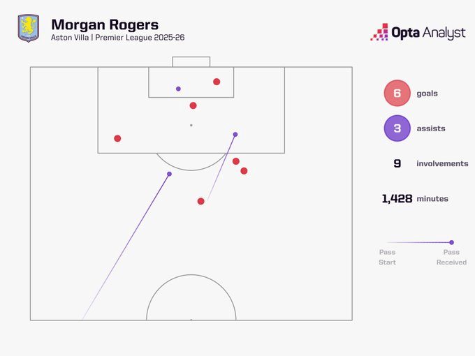 罗杰斯本赛季英超一共参与9球,在英格兰球员中,只有菲尔-福登(同样9次)的参与进球数与他持平。
