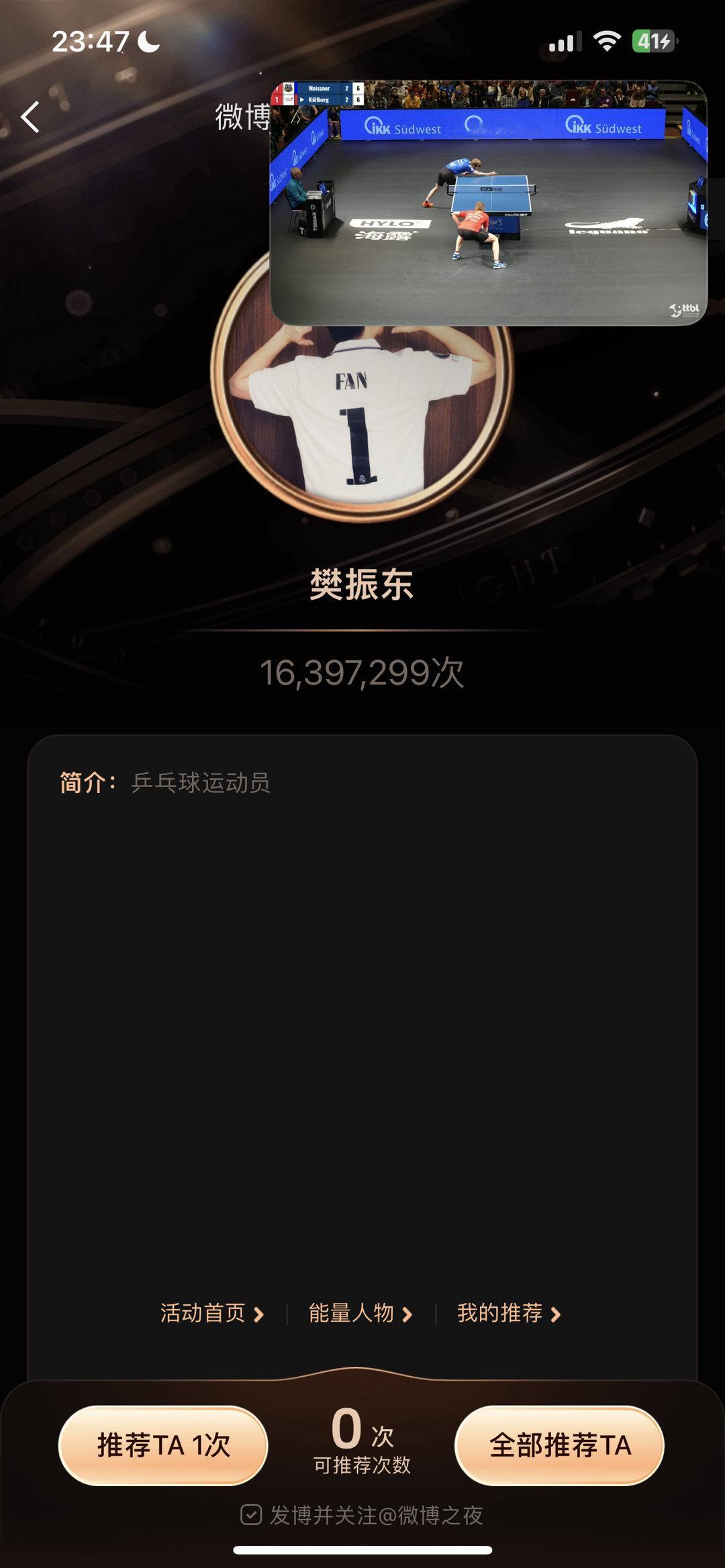 一面看比赛,一面把又攒出来的票数投给樊振东。