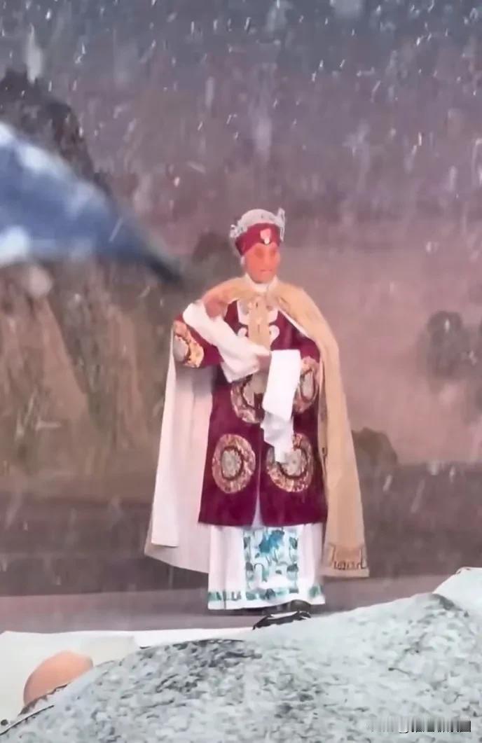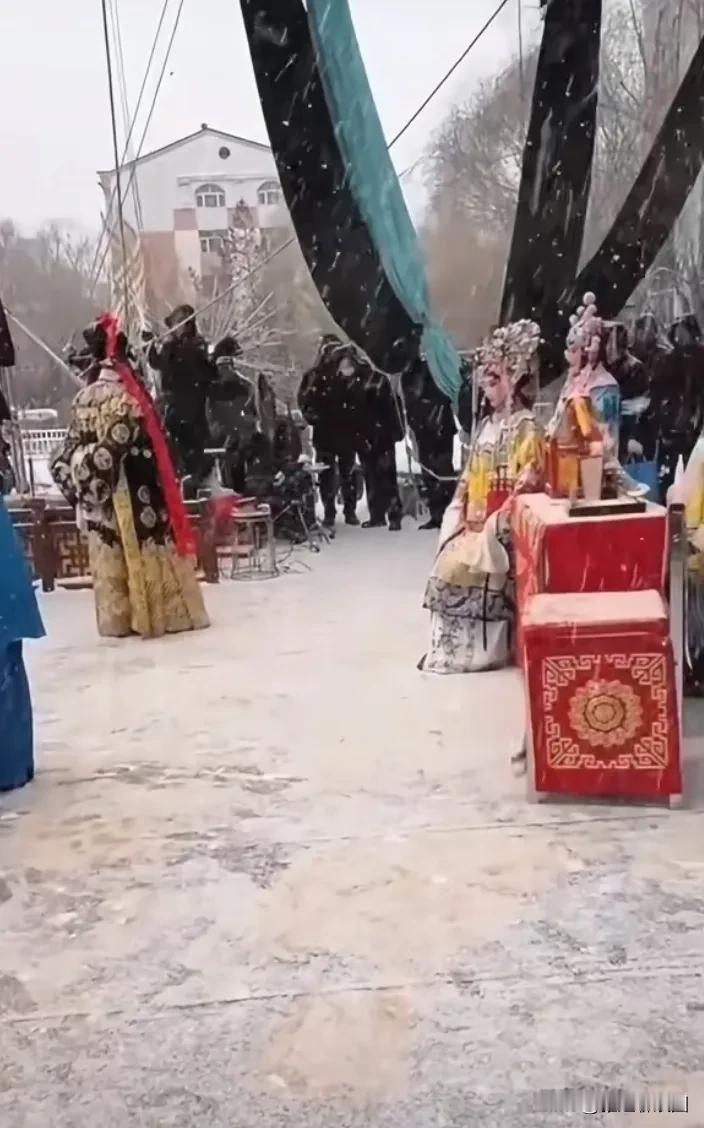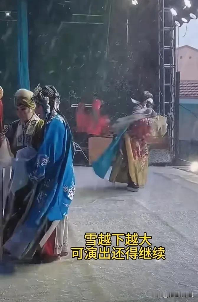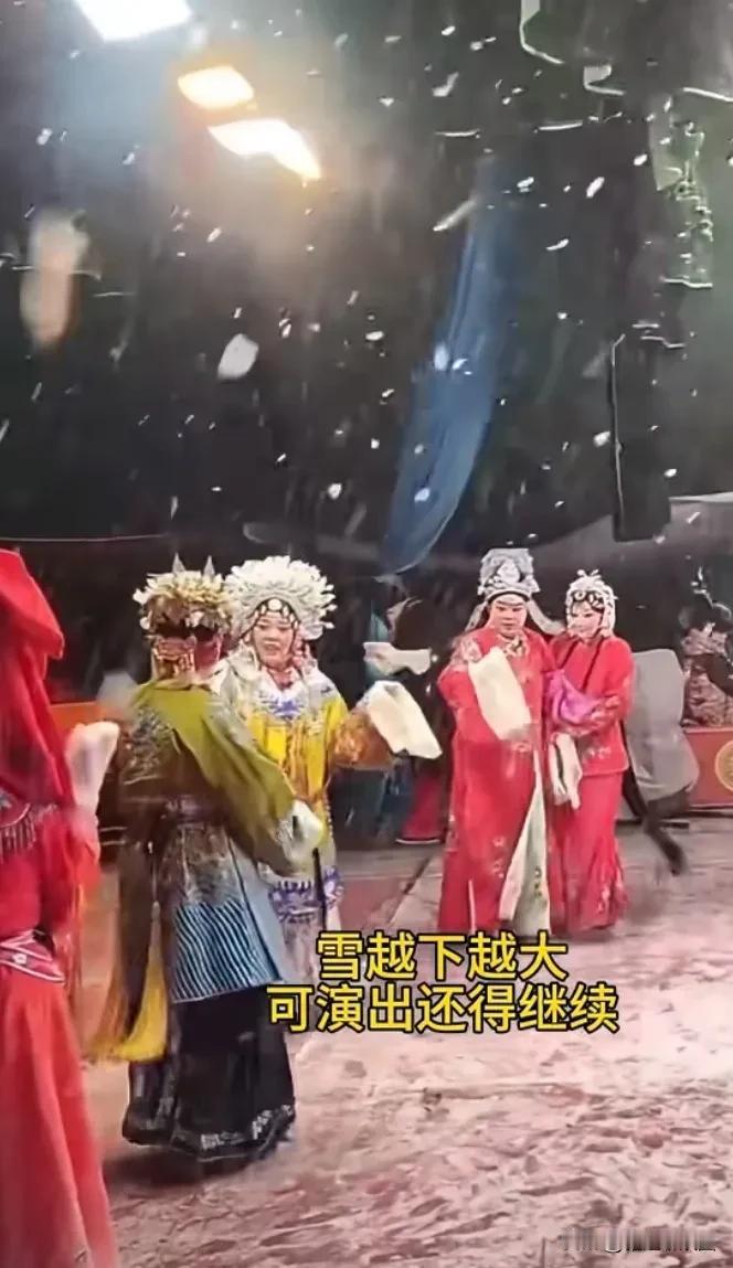 大雪纷飞下,不管台下有没有人,豫剧团照样演出,演员们太辛苦了,给这些敬业的演员点赞,他们的精神令人感动,传承的力量就是伟大 也是诚信、契约精神的本质表现。真的是戏台搭三界,开嗓敬神明。一旦开锣必须唱完,致敬传统文化守护和传承者!