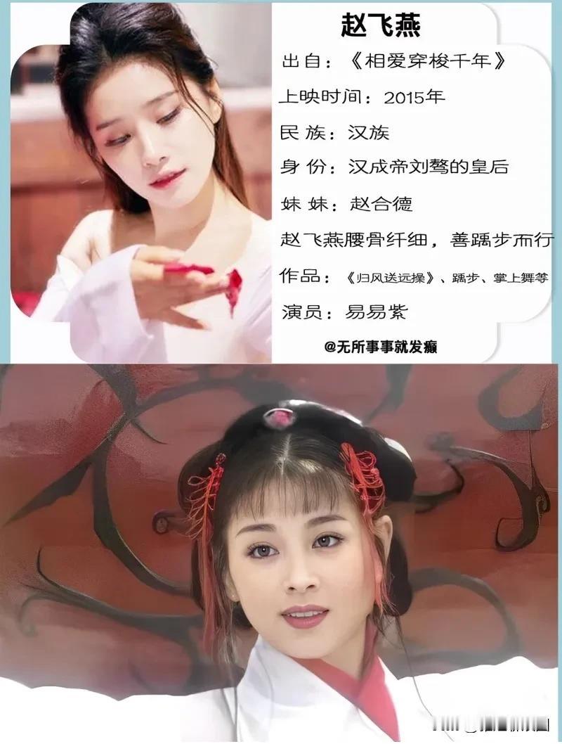 你们喜欢哪个版本的赵飞燕呢?三个版本分别是1996年《汉宫飞燕》的赵明明、2008年《母仪天下》的佟丽娅、2015年《相爱穿越千年》易易紫。 个人喜欢赵明明和佟丽娅都很美,不过赵明明比较偏丰腴感觉更适合杨玉环,佟丽娅赵飞燕本燕,又纤瘦又美又会跳舞。原著说赵飞燕身轻如燕的话,还是觉得佟丽娅更贴近角色。 “赵飞燕后腰骨纤细,善踽步而行,若人手持花枝,颤颤然,他人莫可学也。”就是体态纤细轻盈弱柳扶风才被唤作飞燕,能作掌上舞,跳起舞来勾魂摄魄。