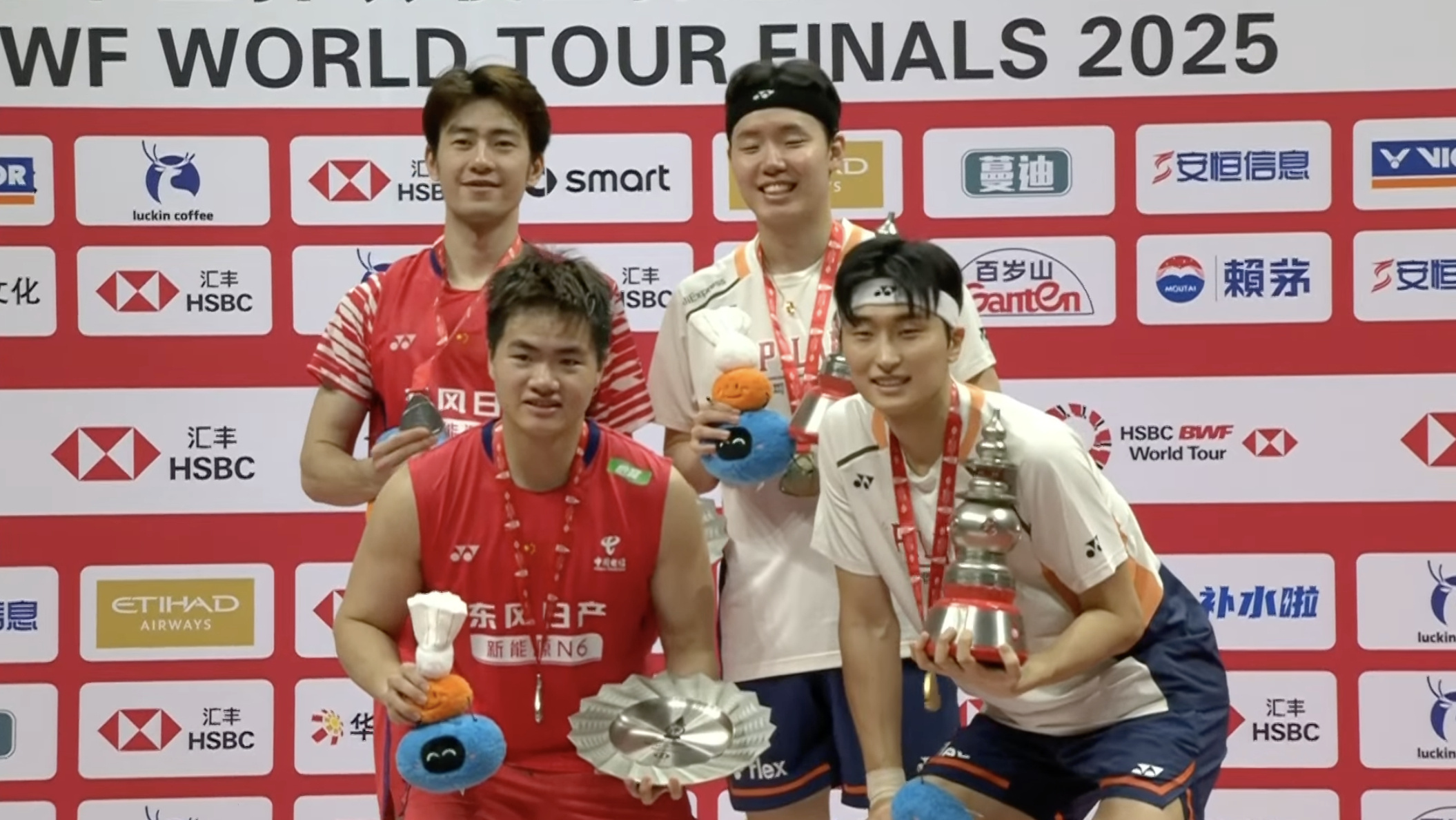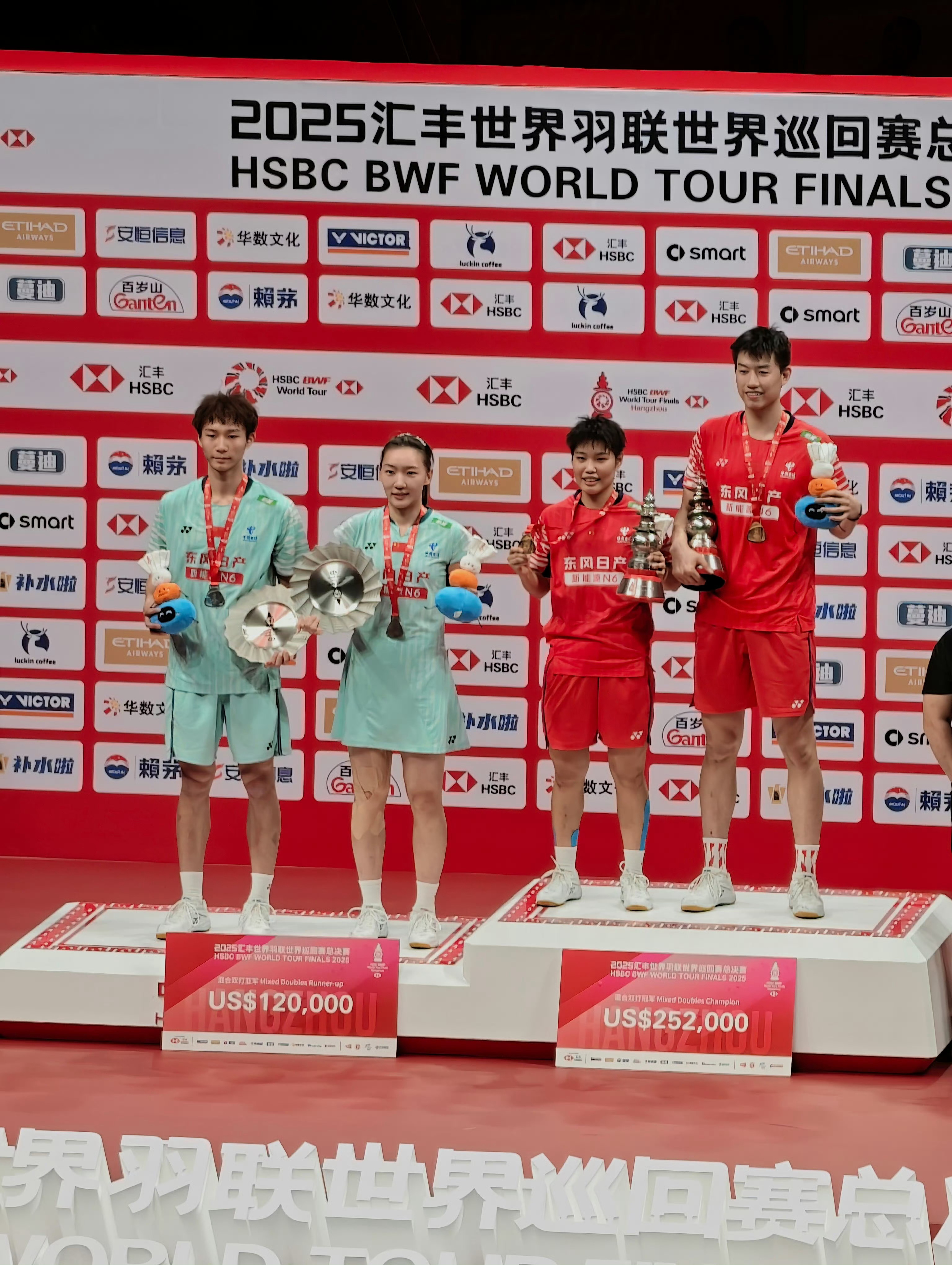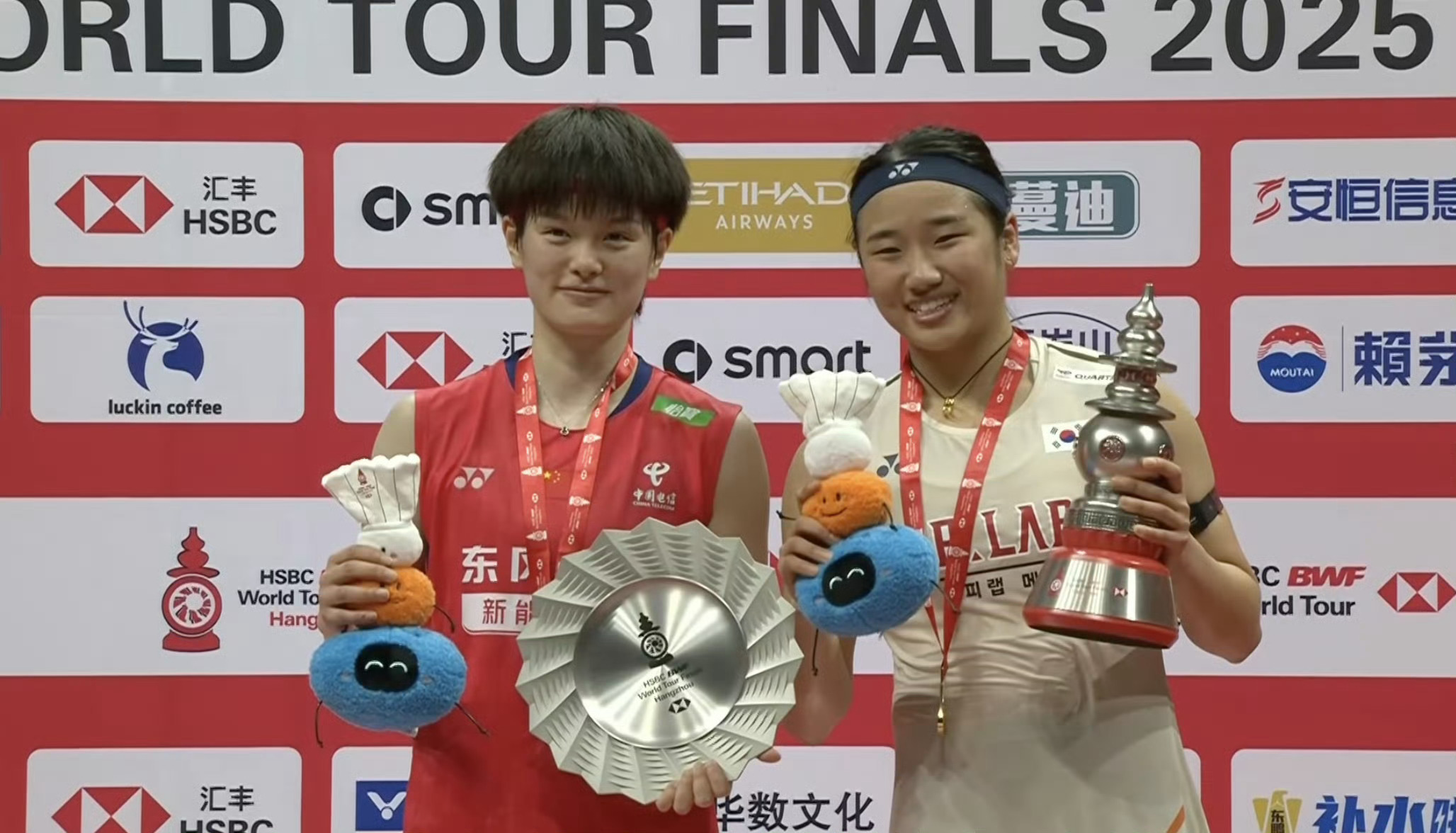 2025年 世界羽联世界巡回赛 总决赛 赛果🏸✨12月17日~12月21日中国 杭州 奥体中心体育馆🇨🇳中国队所获奖牌男单:亚军🥈石宇奇女单:亚军🥈王祉怡男双:亚军🥈梁伟铿/王昶混双:冠军🥇冯彦哲/黄东萍亚军🥈蒋振邦/魏雅欣✨王祉怡1-2安洗莹,用时96分钟。赛后安洗莹把自己的喷雾借给王祉怡用石宇奇脚伤石宇奇赛后采访王祉怡赛后采访冯彦哲、黄东萍赛后采访蒋振邦、魏雅欣赛后采访郑思维、黄雅琼 球员见面会陈清晨、郑思维、黄雅琼、刘雨辰退役仪式