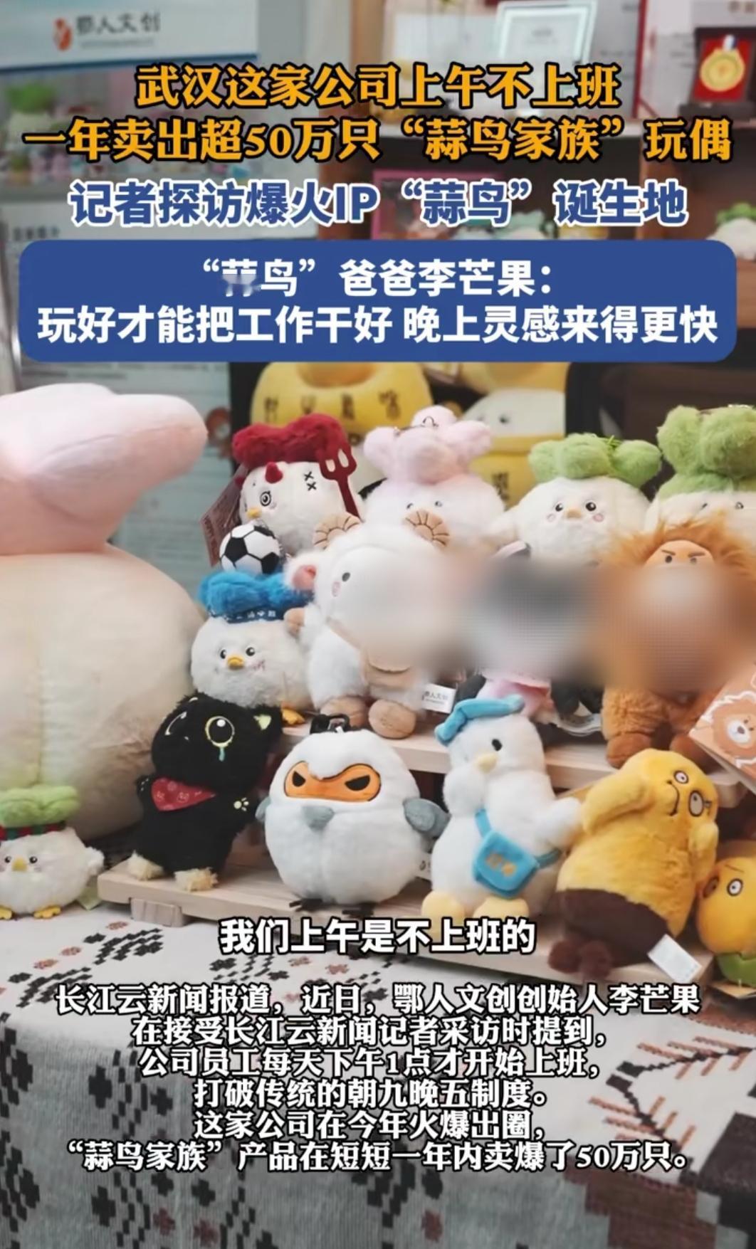 武汉这家公司也太敢了!居然让员工上午不上班,想睡懒觉睡懒觉,想遛弯遛弯,好多人都等着看笑话:这公司怕不是要倒闭?结果人家反手就造出爆火的“蒜鸟家族”,一年卖了50万只玩偶,赚得盆满钵满。 你说奇怪不?咱们卷到凌晨改方案,老板还嫌不够努力,可人家越“佛系”越赚钱。后来才懂,创意这东西真不是逼出来的。员工上午不用被打卡绑架,能陪着孩子吃早餐,能晒着太阳发呆,紧绷的神经松下来了,灵感反而像泉水一样冒出来。 现在好多公司总觉得“熬时长”就是敬业,却忘了人不是机器。真正的高效,从来不是耗时间,而是给员工留足生活的温度。当工作不再是负担,当生活的美好能融入创作,这样的成果才会自带感染力,被大家真心喜欢。你觉得这种“上午不上班”的模式,能复制吗?